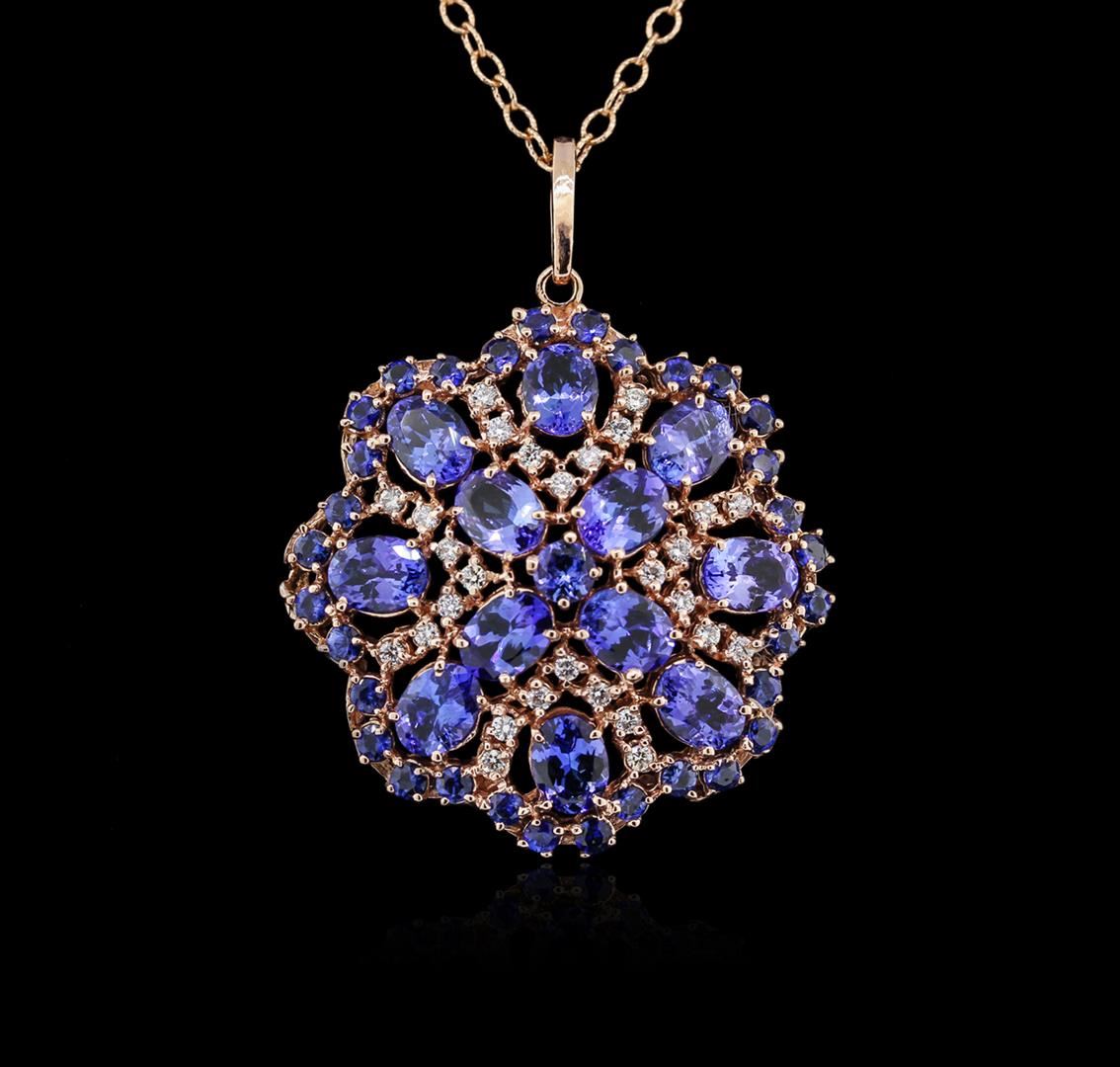 One electronically tested 14KT rose gold ladies cast & assembled tanzanite, sapphire and diamond pendant with chain. The pendant features an elaborate tanzanite and diamond lattice set within a sapphire bezel, completed by a rose gold bail. The pendant is supported by an eighteen inch length rose gold diamond cut link chain, terminating in a lobster claw clasp. Bright polish finish. Identified with markings of "14K". Condition is new, good workmanship. Containing: Twelve prong set oval mixed cut natural tanzanites approximate total weight of 15.60ct., clarity is eye clean, type I, dark, very slightly grayish, violetish blue color, (GIA vB 7/3), cut is good. Transmitting light with no distortion, transparent. Color grade is an average for the group. Graded in the setting. Tanzanite is a very rare gemstone that is only found in the country of Tanzania. Originally discovered in 1967. Tiffany & Company, named the stone Tanzanite. It is found in the Usumburu Mountains that border the Umba Valley of northern Tanzania. Tanzanite occurs in gray, brown, violet, blue, reddish-purple, & green. The gem is interesting because of its exceptional pleochroism. Rotated in different directions a tanzanite will exhibit multiple changes of color. Tanzanite has a low tolerance to ultrasonic cleaning, and should not be cleaned using this method. Thirty-three prong set round mixed cut natural blue sapphires approximate total weight of 4.30ct., clarity is slightly included, type II, dark, moderately strong, blue color, (GIA B 7/4), cut is good. Transmitting light with a minimum of distortion, transparent. Naturally occurring internal & external characteristics are present. Color grade is an average for the group. Indications of laboratory high temperature diffusion treatment. Graded in the setting. Twenty-Eight prong set round brilliant cut diamonds approximate total weight of 28 Stones = 0.90ct. Graded in the setting. Clarity SI-1 to SI-2 Color H - J. Total Weight of Colored Stones 19.90ct. Total Weight of Diamonds 0.90ct. Total Weight of Pendant With Chain 24.10 grams. AIG Appraised at $28,155.00.