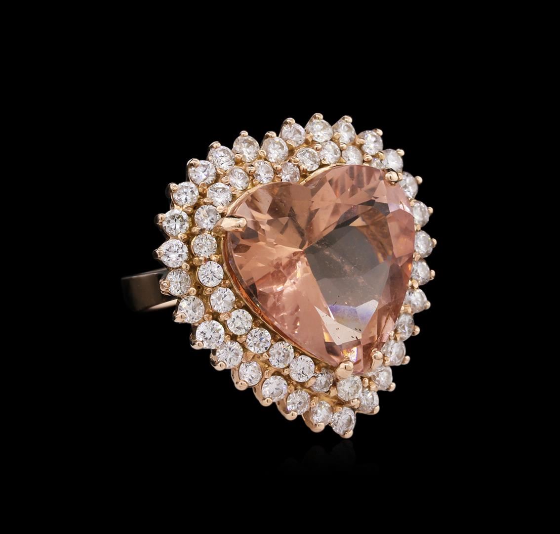 One 14KT Rose Gold ring 10.41 GR Containing: 2.70 CTS round cut diamonds. 15.60 CTS heart shape morganite. All SI Clarity, G-H Color. Fine Cutting and Proportions. RBGS Appraised at $25,000.00.