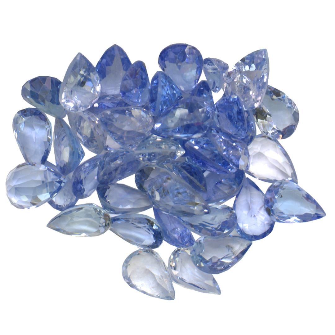 Forty-six pear mixed cut natural tanzanites exact total weight 15.63ct., clarity is slightly included, type I, medium dark, very slightly grayish, bluish violet color, (GIA bV 6/3), cut is good. Transmitting light with a minimum of distortion, transparent. Naturally occurring internal & external characteristics are present. Color grade is an average for the group. Tanzanite is a very rare gemstone that is only found in the country of Tanzania. Originally discovered in 1967. Tiffany & Company, named the stone Tanzanite. It is found in the Usumburu Mountains that border the Umba Valley of northern Tanzania. Tanzanite occurs in gray, brown, violet, blue, reddish-purple, & green. The gem is interesting because of its exceptional pleochroism. Rotated in different directions a tanzanite will exhibit multiple changes of color. Tanzanite has a low tolerance to ultrasonic cleaning, and should not be cleaned using this method. Westfield Appraised at $1,505.00.