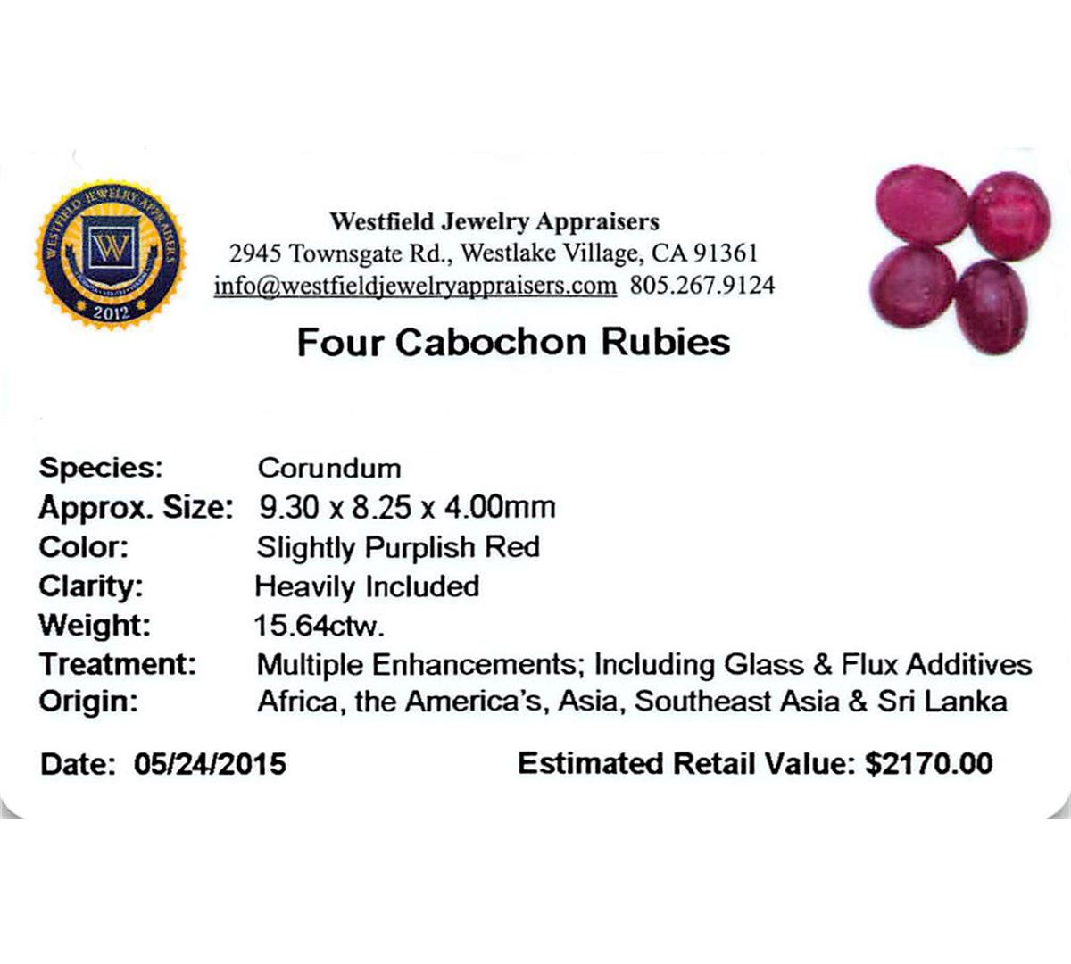 Four oval cabochon cut natural rubies, measuring 9.30 x 8.25 x 4.00mm, exact total weight 15.64ct., clarity is heavily included, type II, dark, very slightly brownish, slightly purplish red color, (GIA slpR 7/3), cut is good. Transmitting light diffusely, translucent to opaque. Naturally occurring internal & external characteristics are present. Indications of laboratory high temperature heat treatment, with glass & flux additives. Ruby has a low tolerance to rhodium plating, repolishing the surface & ultrasonic cleaning. Westfield Appraised at $2,170.00.