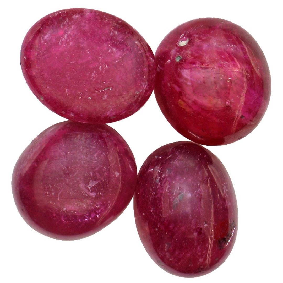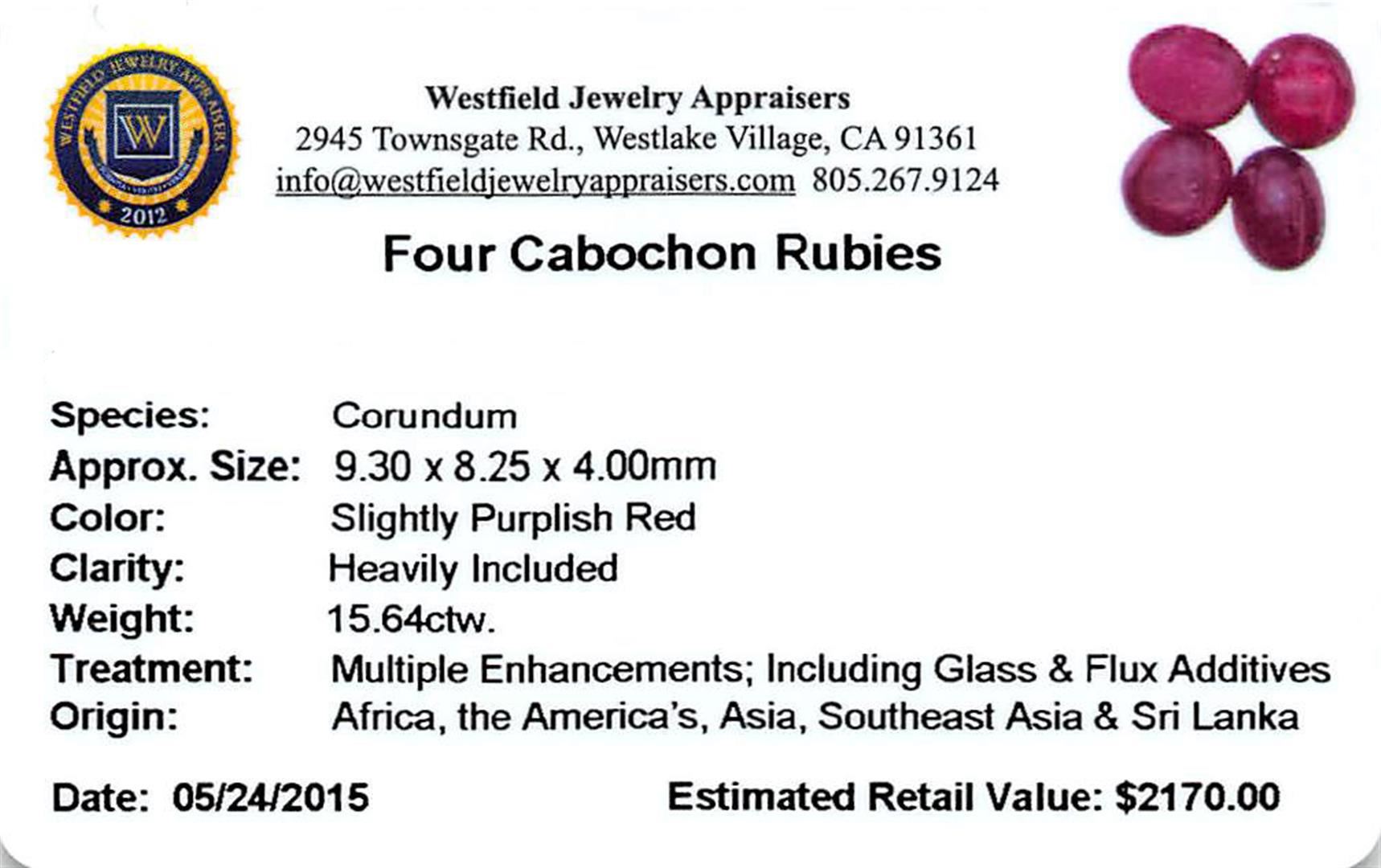 Four oval cabochon cut natural rubies, measuring 9.30 x 8.25 x 4.00mm, exact total weight 15.64ct., clarity is heavily included, type II, dark, very slightly brownish, slightly purplish red color, (GIA slpR 7/3), cut is good. Transmitting light diffusely, translucent to opaque. Naturally occurring internal & external characteristics are present. Indications of laboratory high temperature heat treatment, with glass & flux additives. Ruby has a low tolerance to rhodium plating, repolishing the surface & ultrasonic cleaning._x000D_ Westfield Appraised at $2,170.00.