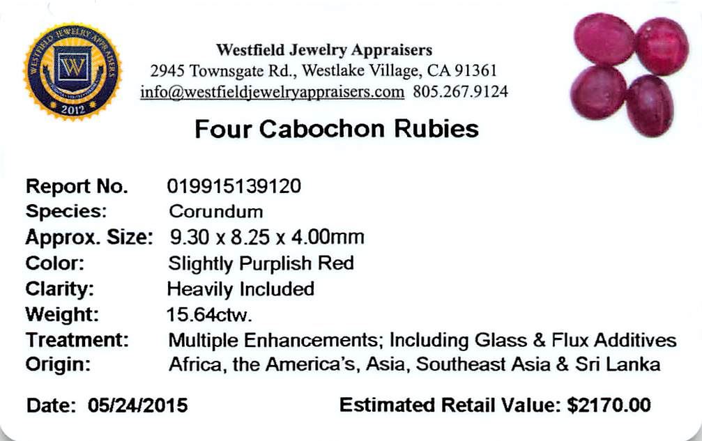 Four oval cabochon cut natural rubies, measuring 9.30 x 8.25 x 4.00mm, exact total weight 15.64ct., clarity is heavily included, type II, dark, very slightly brownish, slightly purplish red color, (GIA slpR 7/3), cut is good. Transmitting light diffusely, translucent to opaque. Naturally occurring internal & external characteristics are present. Indications of laboratory high temperature heat treatment, with glass & flux additives. Ruby has a low tolerance to rhodium plating, repolishing the surface & ultrasonic cleaning. Westfield Appraised at $2,170.00.
