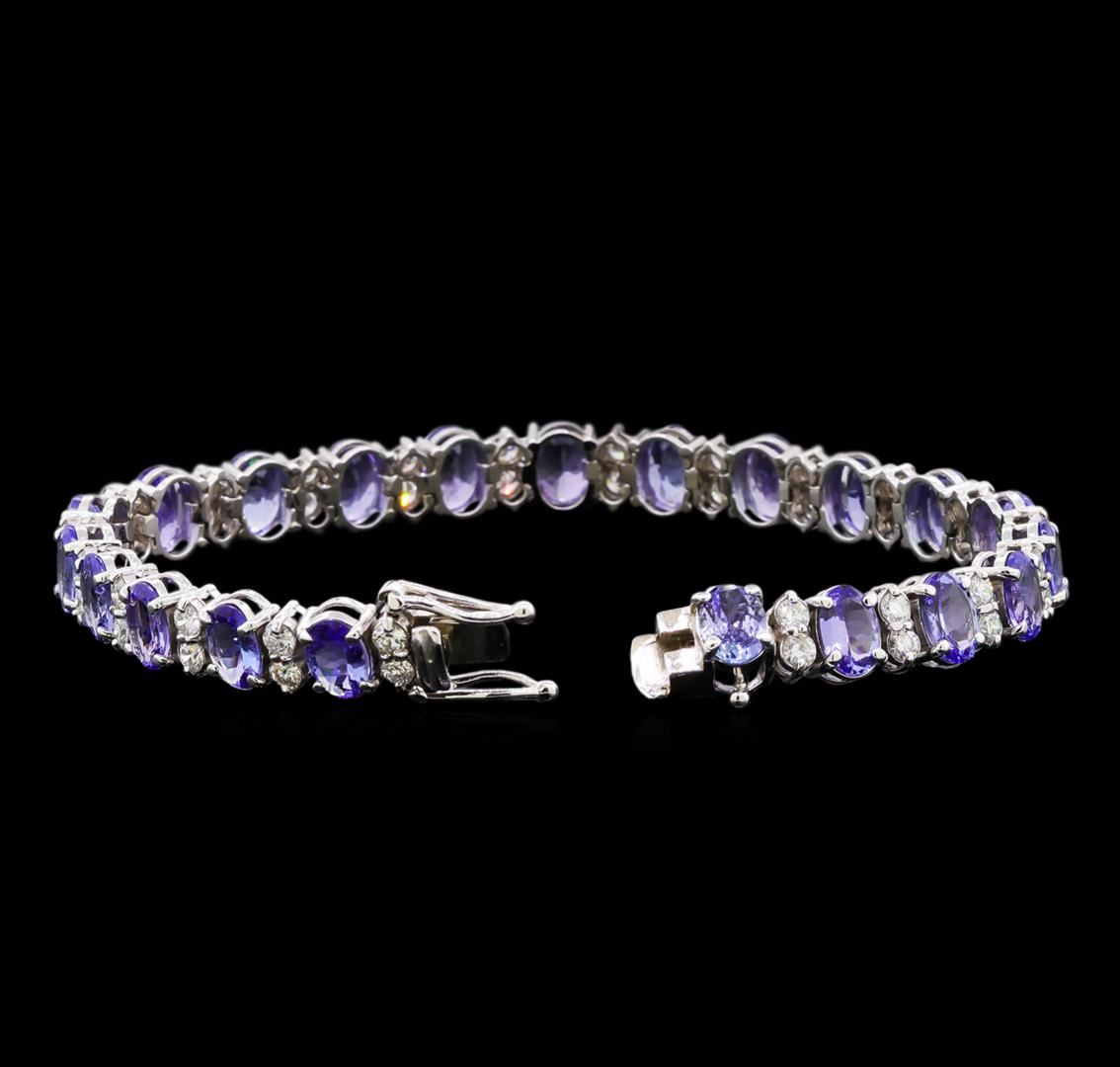One electronically tested 14KT white gold lady's combination cast & assembled fashion straight line bracelet with a tongue clasp with foldover safety with a bright polish finish. The featured lady's bracelet is 7 inches in length. Identified with markings of "14K". Condition is new, good workmanship. Containing: Twenty-one prong set oval modified brilliant cut natural tanzanites, measuring 7.10 x 5.05 x 3.10mm, (depth est.) approximate total weight of 15.66ct., clarity is eye clean, medium, moderately strong, violetish blue color, (GIA vB 5/4), cut is good. Transmitting light with no distortion, transparent. Colored gemstones are presumed to have been subjected to commonly used enhancement processes. Graded in the setting. Forty-Two prong set round brilliant cut diamonds, measuring 2.60 - 2.50 x 1.58mm (depth est.) approximate total weight of 42 Stones = 2.56ct. Graded in the setting. Clarity: VS-2 to SI-2. Color: G - I. Cut Good. Total Weight of Colored Stones 15.66ct. Total Weight of Diamonds 2.56ct. Total Weight of Straight Line Bracelet 18.30gm. GAS Appraised at $19,705.00.
