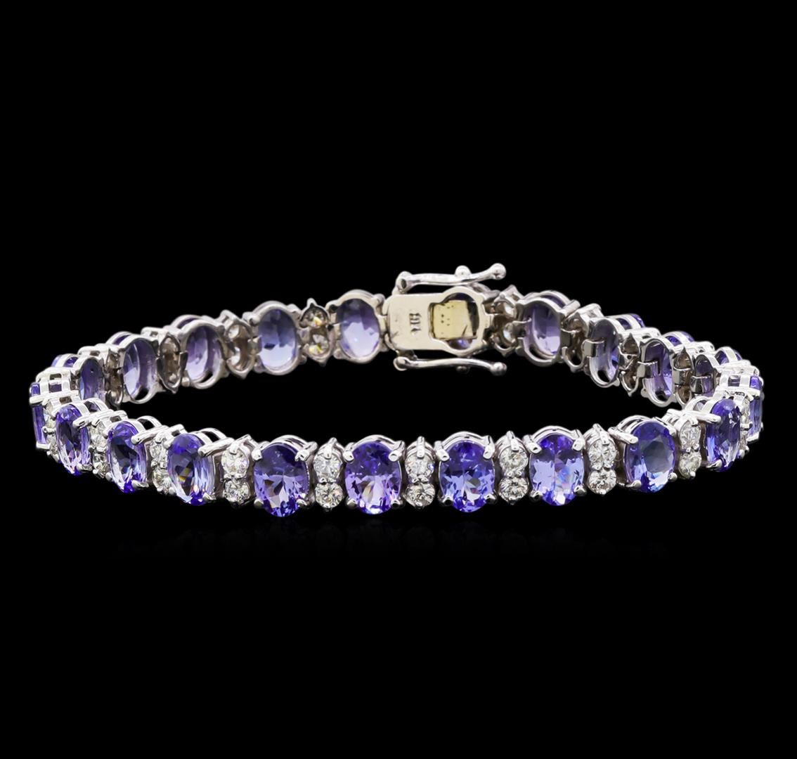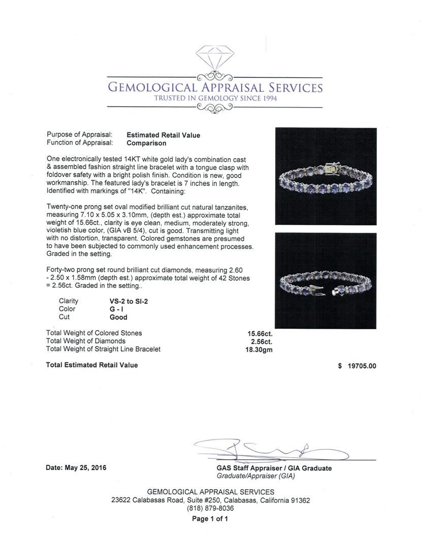 One electronically tested 14KT white gold lady's combination cast & assembled fashion straight line bracelet with a tongue clasp with foldover safety with a bright polish finish. The featured lady's bracelet is 7 inches in length. Identified with markings of "14K". Condition is new, good workmanship. Containing: Twenty-one prong set oval modified brilliant cut natural tanzanites, measuring 7.10 x 5.05 x 3.10mm, (depth est.) approximate total weight of 15.66ct., clarity is eye clean, medium, moderately strong, violetish blue color, (GIA vB 5/4), cut is good. Transmitting light with no distortion, transparent. Colored gemstones are presumed to have been subjected to commonly used enhancement processes. Graded in the setting. Forty-Two prong set round brilliant cut diamonds, measuring 2.60 - 2.50 x 1.58mm (depth est.) approximate total weight of 42 Stones = 2.56ct. Graded in the setting. Clarity: VS-2 to SI-2. Color: G - I. Cut Good. Total Weight of Colored Stones 15.66ct. Total Weight of Diamonds 2.56ct. Total Weight of Straight Line Bracelet 18.30gm. GAS Appraised at $19,705.00.