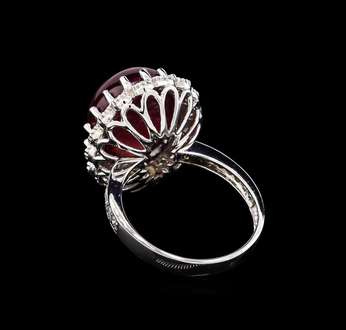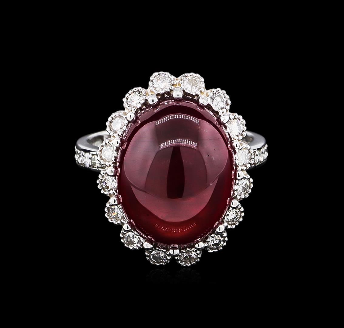 One polished, stamped, and tested 14KT white gold ring mounted with: 1 oval shaped ruby center stone weighing 15.71ct, and 30 faceted round diamonds weighing 0.67ct. This item weighs 7.20 grams, condition is new, excellent workmanship. MAIN GEMSTONE: Species: Natural Corundum. Variety: Ruby. Shape: Oval. Cutting Style: Cabochon. Measurements: 15 x 12mm. Weight: 15.71ct. Color: Red. Cut Grade: Very good. Refractive Index: 1.762 - 1.770 DR. Hardness: 9. ADJACENT GEMSTONES ON RING: Identity: Natural Diamond. Shape: Round. Cutting Style: Brilliant cut. Quantity: 30 diamonds. Measurements: 1.3 - 2.0mm. Total Weight: 0.67ct. Clarity Grade: SI1 - SI3. Color Grade: H - I. Refractive Index: 2.418. Hardness: 10. AIGL Appraised at $6,412.00.