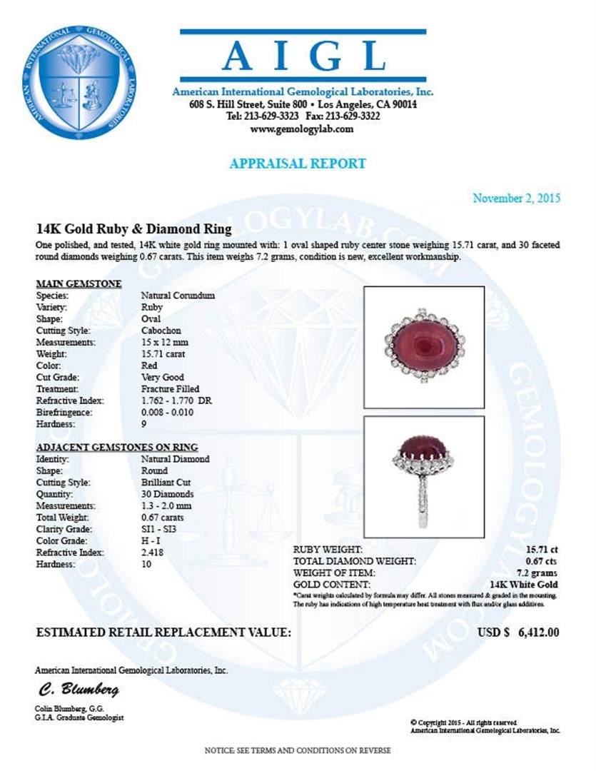 One polished, stamped, and tested 14KT white gold ring mounted with: 1 oval shaped ruby center stone weighing 15.71ct, and 30 faceted round diamonds weighing 0.67ct. This item weighs 7.20 grams, condition is new, excellent workmanship. MAIN GEMSTONE: Species: Natural Corundum. Variety: Ruby. Shape: Oval. Cutting Style: Cabochon. Measurements: 15 x 12mm. Weight: 15.71ct. Color: Red. Cut Grade: Very good. Refractive Index: 1.762 - 1.770 DR. Hardness: 9. ADJACENT GEMSTONES ON RING: Identity: Natural Diamond. Shape: Round. Cutting Style: Brilliant cut. Quantity: 30 diamonds. Measurements: 1.3 - 2.0mm. Total Weight: 0.67ct. Clarity Grade: SI1 - SI3. Color Grade: H - I. Refractive Index: 2.418. Hardness: 10. AIGL Appraised at $6,412.00.