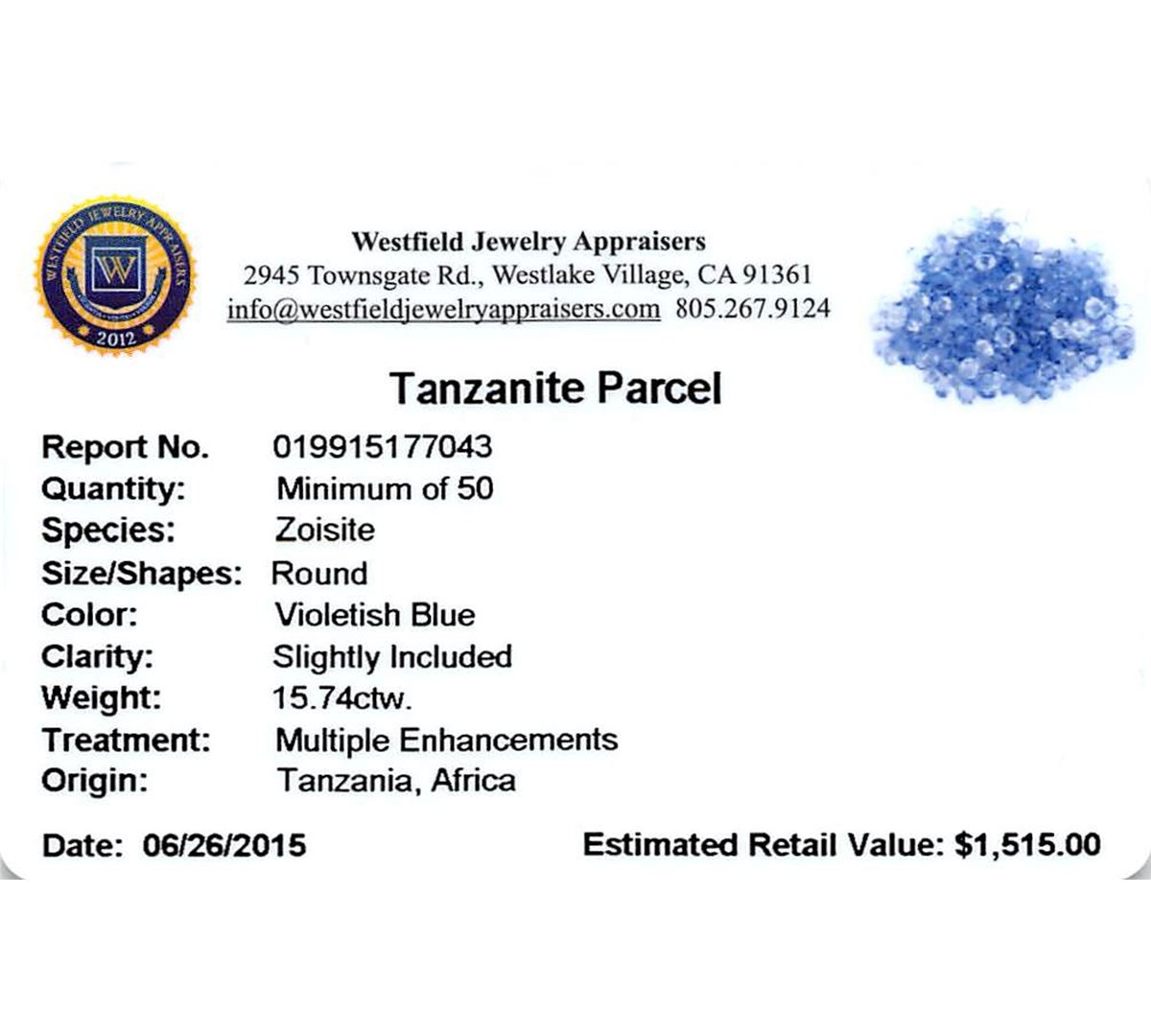 Fifty round mixed cut natural tanzanites, measuring 2.00 - 2.00 x 1.30 mm, exact total weight 15.74ct., clarity is slightly included, type I, medium, very slightly grayish, violetish blue color, (GIA vB 5/3), cut is good. Measurements & the color grade are an average for the group, Color grade is an average for the group, Transmitting light with no distortion, transparent, Naturally occurring internal & external characteristics are present, Indications of multiple laboratory enhancements, including high temperature heat treatment. Westfield Appraised at $1,515.00.