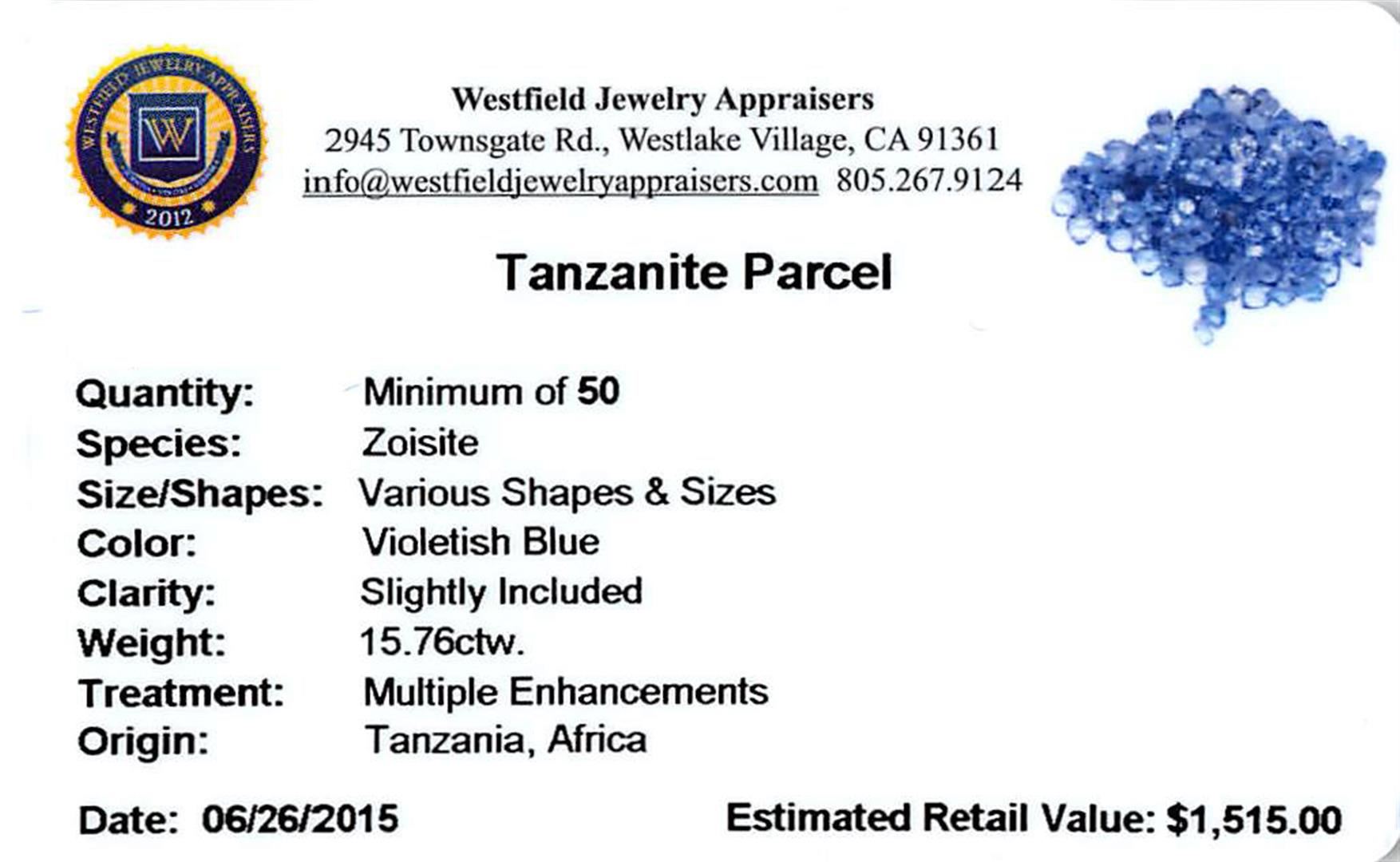 Fifty round mixed cut natural tanzanites, measuring 3.00 - 3.00 x 1.95 mm, exact total weight 15.76ct., clarity is slightly included, type I, medium, very slightly grayish, violetish blue color, (GIA vB 5/3), cut is good. Measurements & the color grade are an average for the group, Color grade is an average for the group, Transmitting light with no distortion, transparent, Naturally occurring internal & external characteristics are present, Indications of multiple laboratory enhancements, including high temperature heat treatment. Westfield Appraised at $1,515.00.
