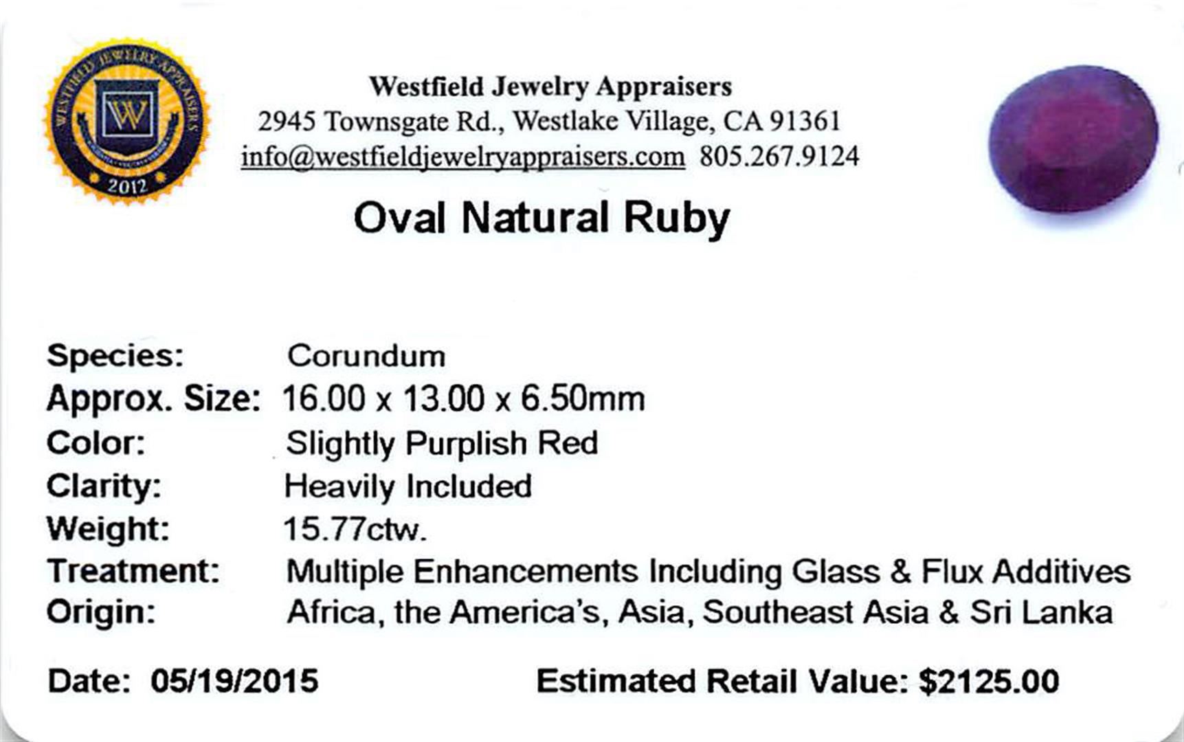 One oval mixed cut natural ruby, measuring 15.00 x 14.00 x 8.00mm, exact weight 15.77ct., clarity is heavily included, type II, dark, very slightly brownish, slightly purplish red color, (GIA slpR 7/3), cut is good. Transmitting light somewhat diffusely, transparent to translucent. Naturally occurring internal & external characteristics are present. Indications of laboratory high temperature heat treatment, with glass & flux additives. Ruby has a low tolerance to rhodium plating, repolishing the surface, & ultrasonic cleaning. Westfield Appraised at $2,125.00.