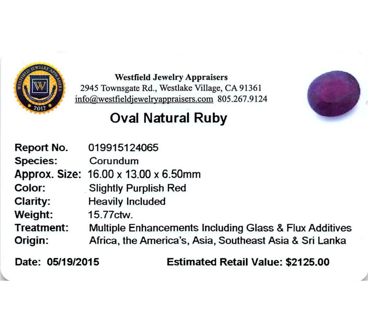 One oval mixed cut natural ruby, measuring 15.00 x 14.00 x 8.00mm, exact weight 15.77ct., clarity is heavily included, type II, dark, very slightly brownish, slightly purplish red color, (GIA slpR 7/3), cut is good. Transmitting light somewhat diffusely, transparent to translucent. Naturally occurring internal & external characteristics are present. Indications of laboratory high temperature heat treatment, with glass & flux additives. Ruby has a low tolerance to rhodium plating, repolishing the surface, & ultrasonic cleaning. Westfield Appraised at $2,125.00.