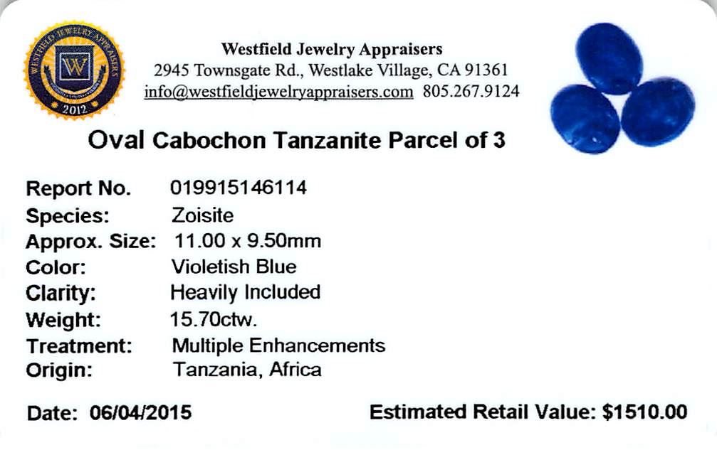 Three oval cabochon cut natural tanzanites, measuring 11.00 x 9.50 x 6.18mm, exact total weight 15.70ct., clarity is heavily included, type I, dark, moderately strong, violetish blue color, (GIA vB 7/4), cut is good. Transmitting light somewhat diffusely, transparent to translucent. Naturally occurring internal & external characteristics are present. Measurements & the color grade are an average for the group. Tanzanite is a very rare gemstone that is only found in the country of Tanzania. Originally discovered in 1967. Tiffany & Company, named the stone Tanzanite. It is found in the Usumburu Mountains that border the Umba Valley of northern Tanzania. Tanzanite occurs in gray, brown, violet, blue, reddish-purple, & green. The gem is interesting because of its exceptional pleochroism. Rotated in different directions a tanzanite will exhibit multiple changes of color. Tanzanite has a low tolerance to ultrasonic cleaning, and should not be cleaned using this method. Westfield Appraised at $1,510.00.