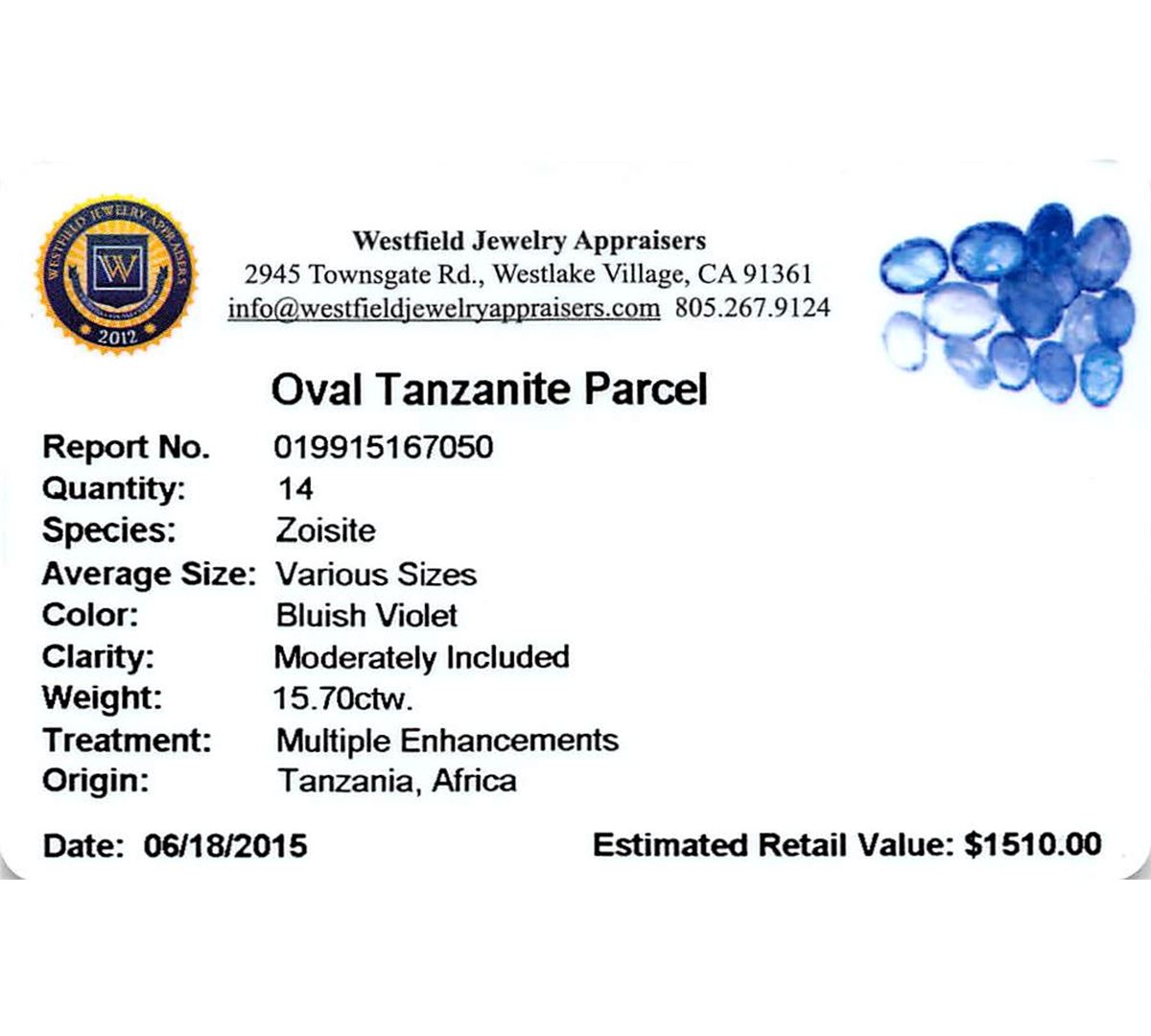 Fourteen oval mixed cut natural tanzanites exact total weight 15.70ct., clarity is moderately included, type I, medium dark, very slightly grayish, bluish violet color, (GIA bV 6/3), cut is good. Transmitting light with a minimum of distortion, transparent. Naturally occurring internal & external characteristics are present. Color grade is an average for the group. Tanzanite is a very rare gemstone that is only found in the country of Tanzania. Originally discovered in 1967. Tiffany & Company, named the stone Tanzanite. It is found in the Usumburu Mountains that border the Umba Valley of northern Tanzania. Tanzanite occurs in gray, brown, violet, blue, reddish-purple, & green. The gem is interesting because of its exceptional pleochroism. Rotated in different directions a tanzanite will exhibit multiple changes of color. Tanzanite has a low tolerance to ultrasonic cleaning, and should not be cleaned using this method. Westfield Appraised at $1,510.00.