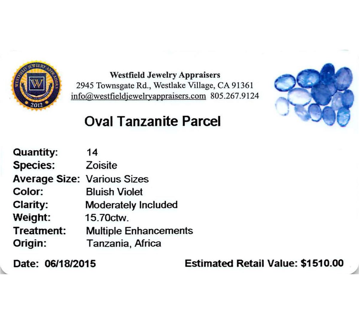 Fourteen oval mixed cut natural tanzanites exact total weight 15.70ct., clarity is moderately included, type I, medium dark, very slightly grayish, bluish violet color, (GIA bV 6/3), cut is good. Transmitting light with a minimum of distortion, transparent. Naturally occurring internal & external characteristics are present. Color grade is an average for the group. Tanzanite is a very rare gemstone that is only found in the country of Tanzania. Originally discovered in 1967. Tiffany & Company, named the stone Tanzanite. It is found in the Usumburu Mountains that border the Umba Valley of northern Tanzania. Tanzanite occurs in gray, brown, violet, blue, reddish-purple, & green. The gem is interesting because of its exceptional pleochroism. Rotated in different directions a tanzanite will exhibit multiple changes of color. Tanzanite has a low tolerance to ultrasonic cleaning, and should not be cleaned using this method. Westfield Appraised at $1,510.00.