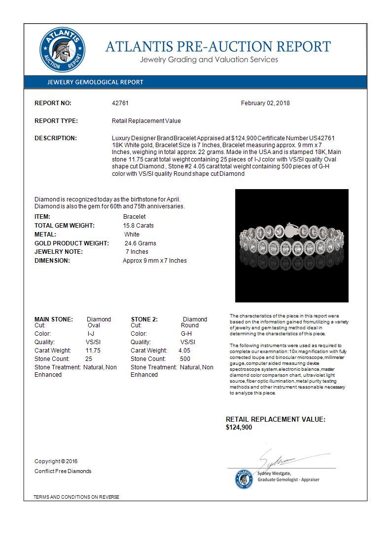 REF-2838K8W -42761 ---- 15.8 CTW Oval Diamond Designer Bracelet 18K White Gold ---- Luxury Designer Brand Bracelet Appraised at $124,900 Certificate Number US42761 18K White gold, Bracelet Size is 7 Inches, Bracelet measuring approx. 9 mm x 7 Inches, weighing in total approx. 22 grams. Made in the USA and is stamped 18K, Main stone 11.75 carat total weight containing 25 pieces of I-J color with VS/SI quality Oval shape cut Diamond , Stone #2 4.05 carat total weight containing 500 pieces of G-H color with VS/SI quality Round shape cut Diamond