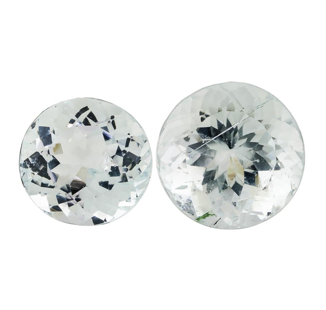 One natural round cut aquamarine parcel of two with an exact weight of 15.80ctw., clarity is slightly included, slightly grayish greenish blue. Gemological Appraisals Services estimates the retail value at $4740 GAS Appraised.