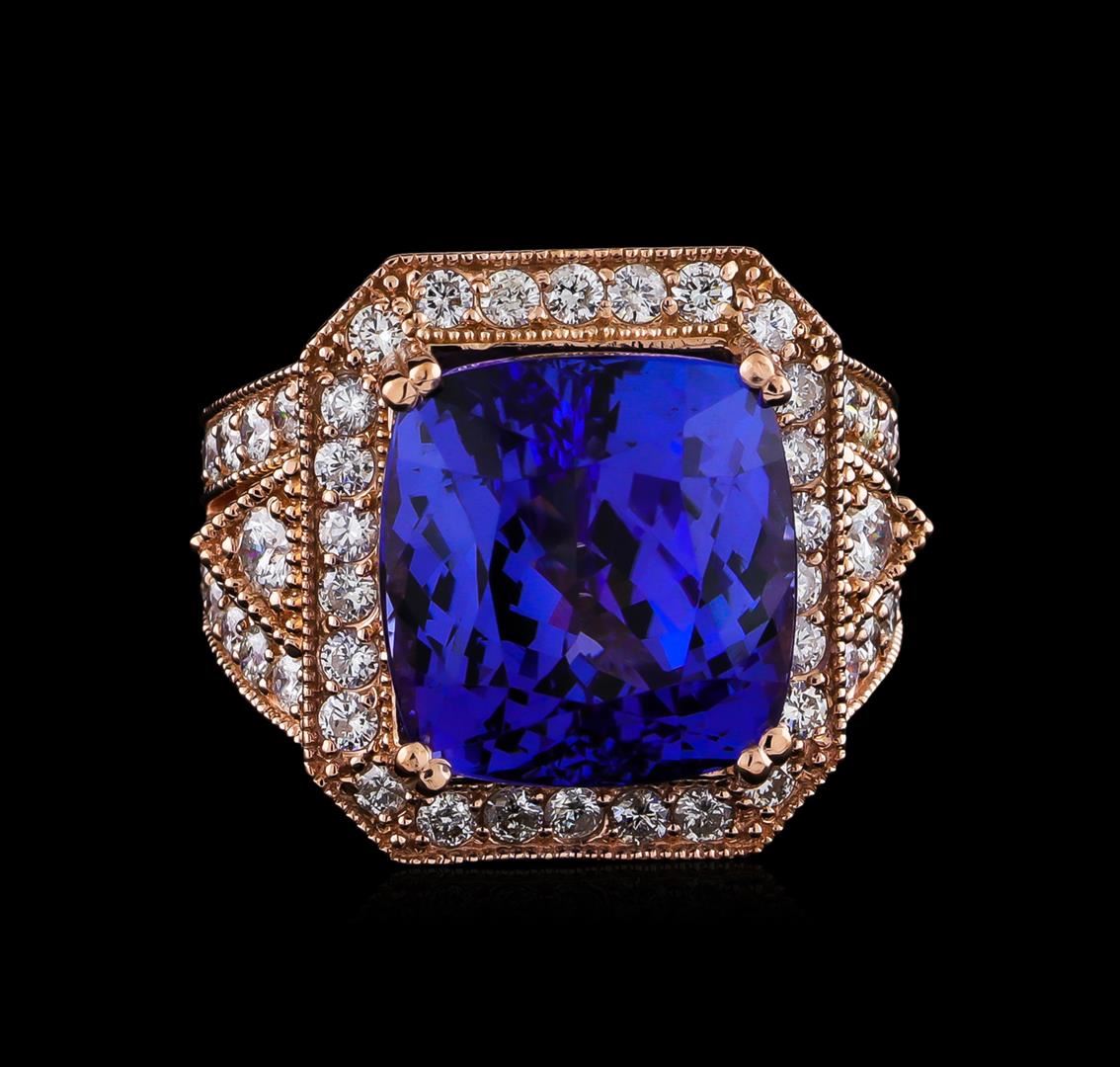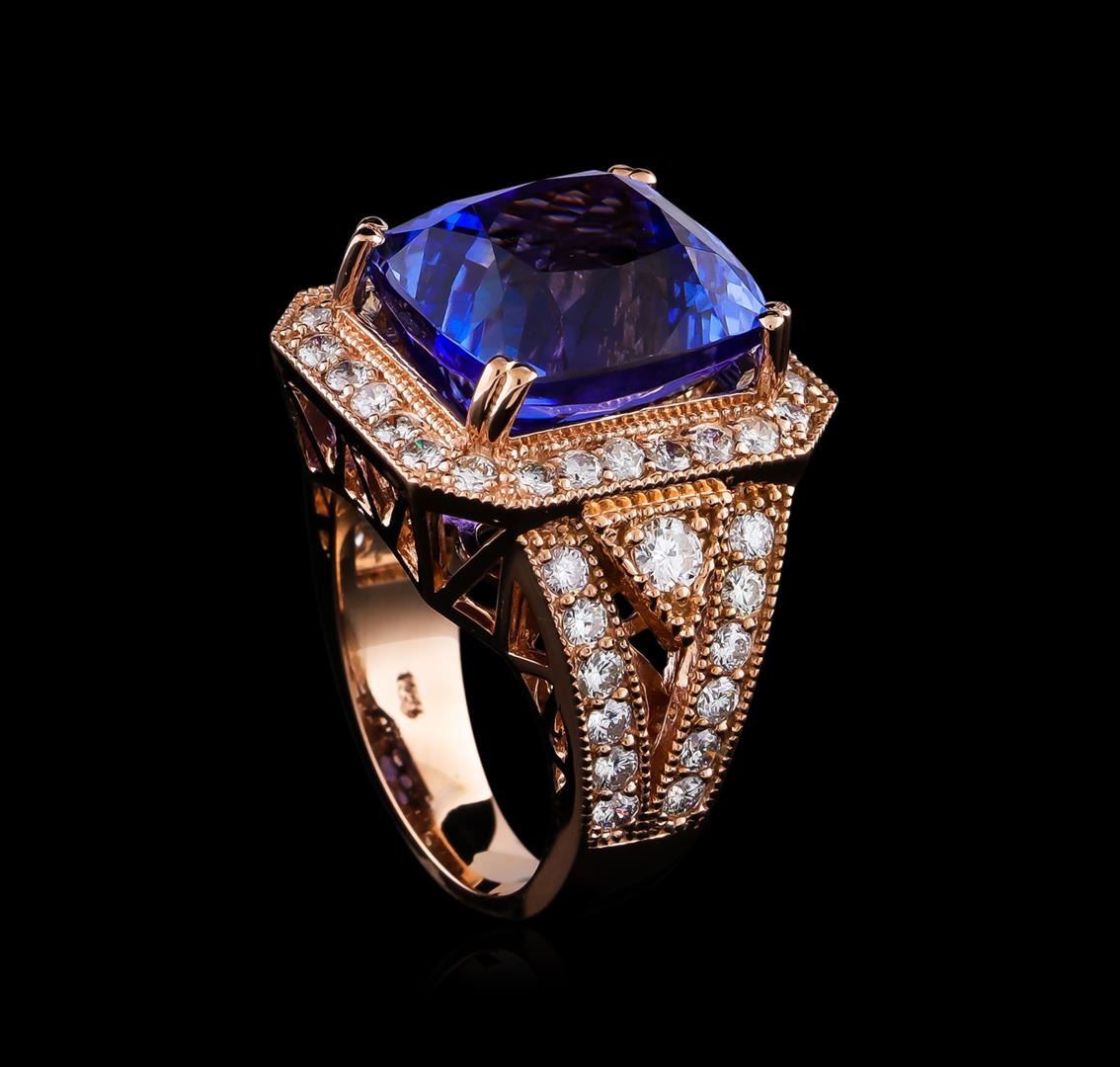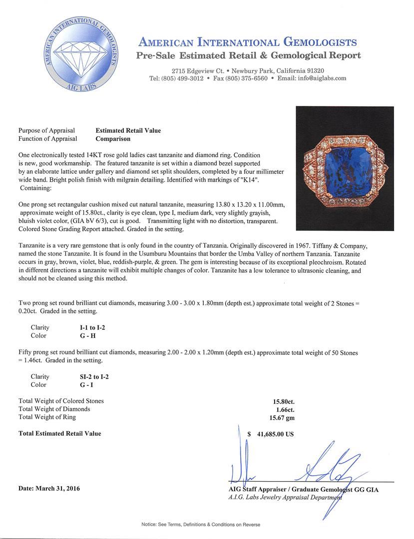 One electronically tested 14KT rose gold ladies cast tanzanite and diamond ring. The featured tanzanite is set within a diamond bezel supported by an elaborate lattice under gallery and diamond set split shoulders, completed by a four millimeter wide band. Bright polish finish with milgrain detailing. Identified with markings of "K14". Condition is new, good workmanship. Containing: One prong set rectangular cushion mixed cut natural tanzanite, measuring 13.80 x 13.20 x 11.00mm, approximate weight of 15.80ct., clarity is eye clean, type I, medium dark, very slightly grayish, bluish violet color, (GIA bV 6/3), cut is good. Transmitting light with no distortion, transparent. Colored Stone Grading Report attached. Graded in the setting. Tanzanite is a very rare gemstone that is only found in the country of Tanzania. Originally discovered in 1967. Tiffany & Company, named the stone Tanzanite. It is found in the Usumburu Mountains that border the Umba Valley of northern Tanzania. Tanzanite occurs in gray, brown, violet, blue, reddish-purple, & green. The gem is interesting because of its exceptional pleochroism. Rotated in different directions a tanzanite will exhibit multiple changes of color. Tanzanite has a low tolerance to ultrasonic cleaning, and should not be cleaned using this method. Two prong set round brilliant cut diamonds, measuring 3.00 - 3.00 x 1.80mm (depth est.) approximate total weight of 2 Stones = 0.20ct. Graded in the setting. Clarity: I-1 to I-2. Color: G - H Fifty prong set round brilliant cut diamonds, measuring 2.00 - 2.00 x 1.20mm (depth est.) approximate total weight of 50 Stones = 1.46ct. Graded in the setting. Clarity: SI-2 to I-2. Color: G - I. Total Weight of Colored Stones 15.80ct. Total Weight of Diamonds 1.66ct. Total Weight of Ring 15.67gm. AIG Appraised at $41,685.00.