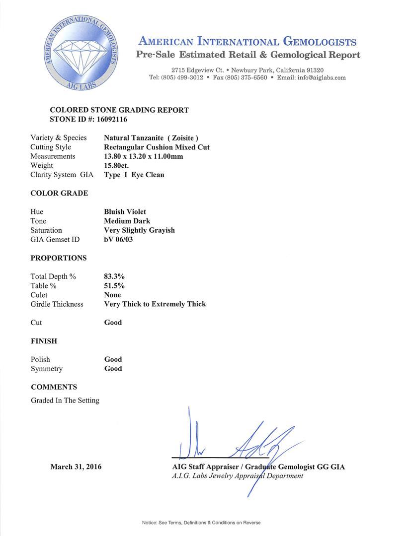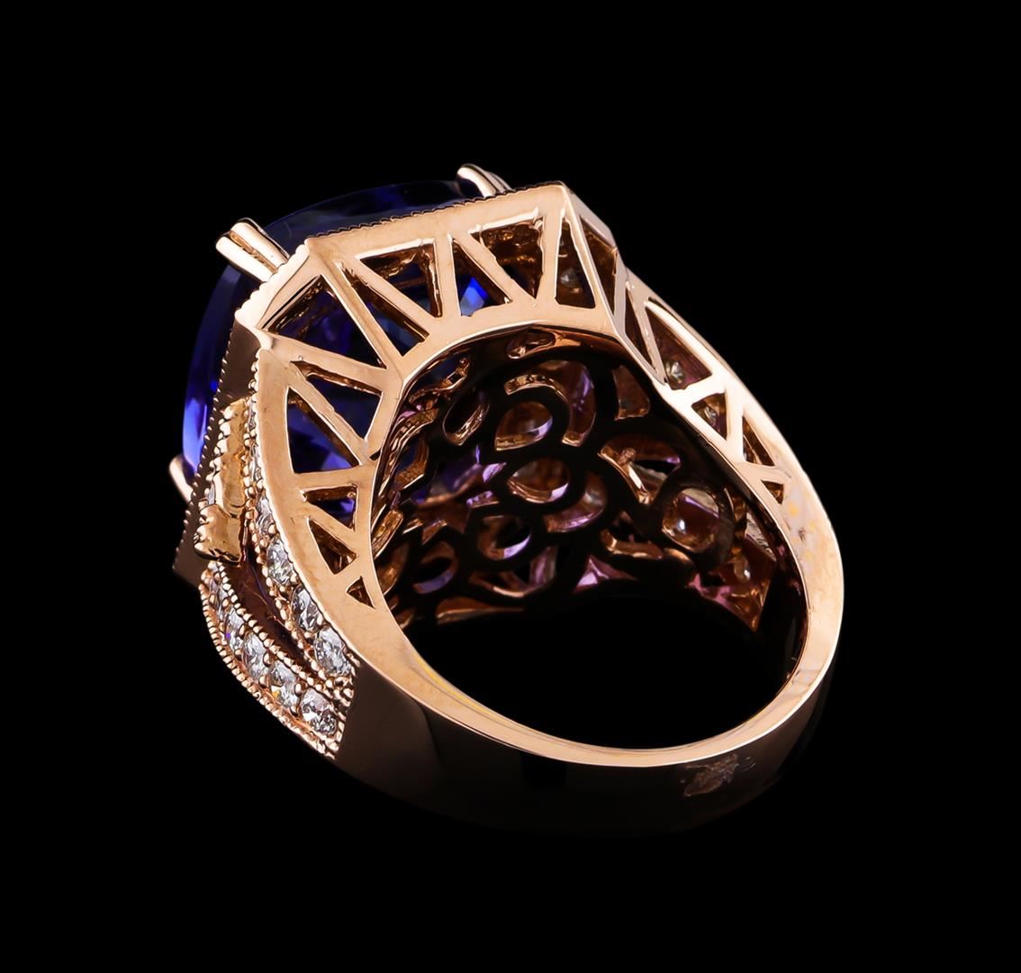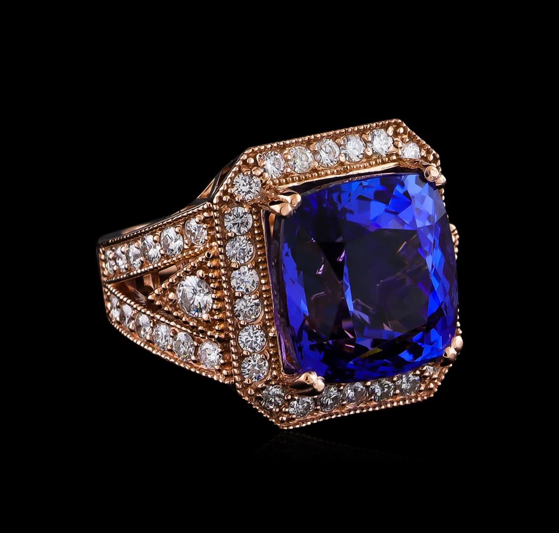 One electronically tested 14KT rose gold ladies cast tanzanite and diamond ring. The featured tanzanite is set within a diamond bezel supported by an elaborate lattice under gallery and diamond set split shoulders, completed by a four millimeter wide band. Bright polish finish with milgrain detailing. Identified with markings of "K14". Condition is new, good workmanship. Containing: One prong set rectangular cushion mixed cut natural tanzanite, measuring 13.80 x 13.20 x 11.00mm, approximate weight of 15.80ct., clarity is eye clean, type I, medium dark, very slightly grayish, bluish violet color, (GIA bV 6/3), cut is good. Transmitting light with no distortion, transparent. Colored Stone Grading Report attached. Graded in the setting. Tanzanite is a very rare gemstone that is only found in the country of Tanzania. Originally discovered in 1967. Tiffany & Company, named the stone Tanzanite. It is found in the Usumburu Mountains that border the Umba Valley of northern Tanzania. Tanzanite occurs in gray, brown, violet, blue, reddish-purple, & green. The gem is interesting because of its exceptional pleochroism. Rotated in different directions a tanzanite will exhibit multiple changes of color. Tanzanite has a low tolerance to ultrasonic cleaning, and should not be cleaned using this method. Two prong set round brilliant cut diamonds, measuring 3.00 - 3.00 x 1.80mm (depth est.) approximate total weight of 2 Stones = 0.20ct. Graded in the setting. Clarity: I-1 to I-2. Color: G - H Fifty prong set round brilliant cut diamonds, measuring 2.00 - 2.00 x 1.20mm (depth est.) approximate total weight of 50 Stones = 1.46ct. Graded in the setting. Clarity: SI-2 to I-2. Color: G - I. Total Weight of Colored Stones 15.80ct. Total Weight of Diamonds 1.66ct. Total Weight of Ring 15.67gm. AIG Appraised at $41,685.00.