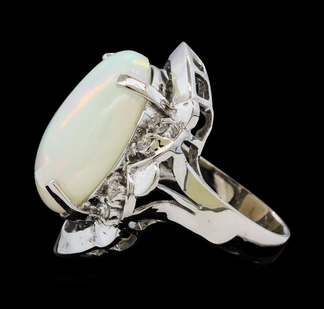 One electronically tested 14KT white gold lady's cast fashion ring with a bright polish finish. The featured lady's ring has a shank measuring 4.15 millimeters wide. Identified with markings of 'K14'. Condition is new, good workmanship. Containing: One crystal opal that is cut in a oval shaped cabochon and is prong set, measuring 21.10 mm long x 17.15 mm wide, and 9.35 mm thick and the approximate weight is 15.82 carats. The opal has a somewhat bright, multicolor play of color (fire) in a rolling flashfire pattern; a medium dome; a good cut; no inclusions; consistent in its brightness and pattern; and is not directional. Graded in the setting. Eight prong set round brilliant cut diamonds, measuring 2.10 - 2.00 x 1.23mm (depth est.) approximate total weight of 8 Stones = 0.25ct. Graded in the setting. Clarity SI-1 to I-1. Color: G - H Cut Good. Total Weight of Diamonds 0.25ct.. Total Weight of Opals 15.82ct.. Total Weight of Ring 11.60gm. GAS Appraised at $7,680.00.