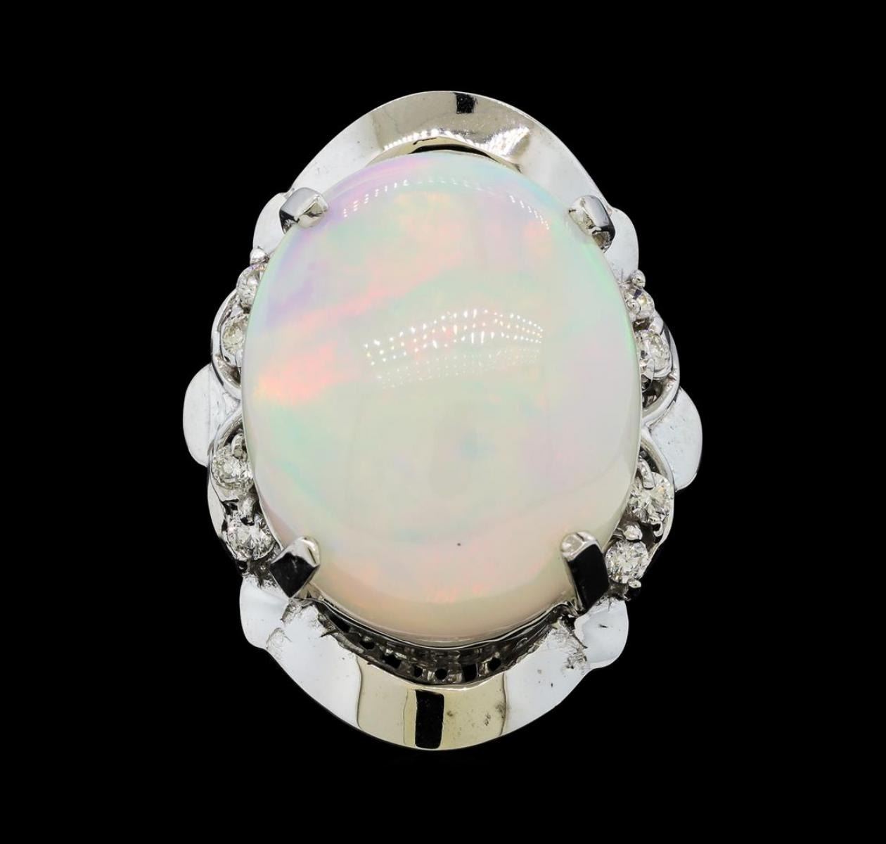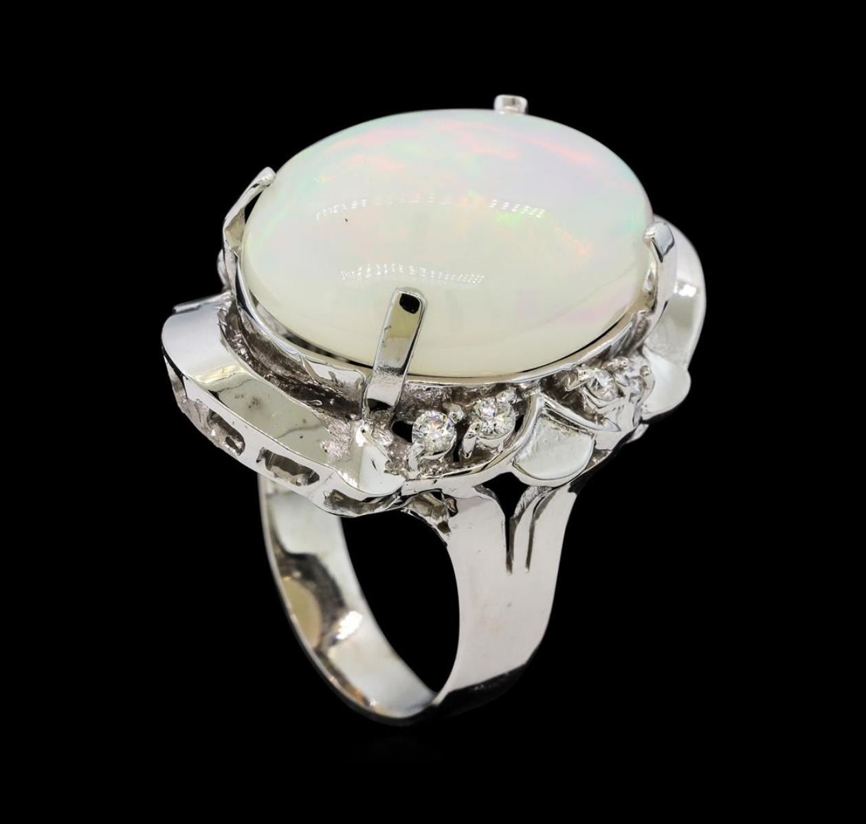 One electronically tested 14KT white gold lady's cast fashion ring with a bright polish finish. The featured lady's ring has a shank measuring 4.15 millimeters wide. Identified with markings of 'K14'. Condition is new, good workmanship. Containing: One crystal opal that is cut in a oval shaped cabochon and is prong set, measuring 21.10 mm long x 17.15 mm wide, and 9.35 mm thick and the approximate weight is 15.82 carats. The opal has a somewhat bright, multicolor play of color (fire) in a rolling flashfire pattern; a medium dome; a good cut; no inclusions; consistent in its brightness and pattern; and is not directional. Graded in the setting. Eight prong set round brilliant cut diamonds, measuring 2.10 - 2.00 x 1.23mm (depth est.) approximate total weight of 8 Stones = 0.25ct. Graded in the setting. Clarity SI-1 to I-1. Color: G - H Cut Good. Total Weight of Diamonds 0.25ct.. Total Weight of Opals 15.82ct.. Total Weight of Ring 11.60gm. GAS Appraised at $7,680.00.