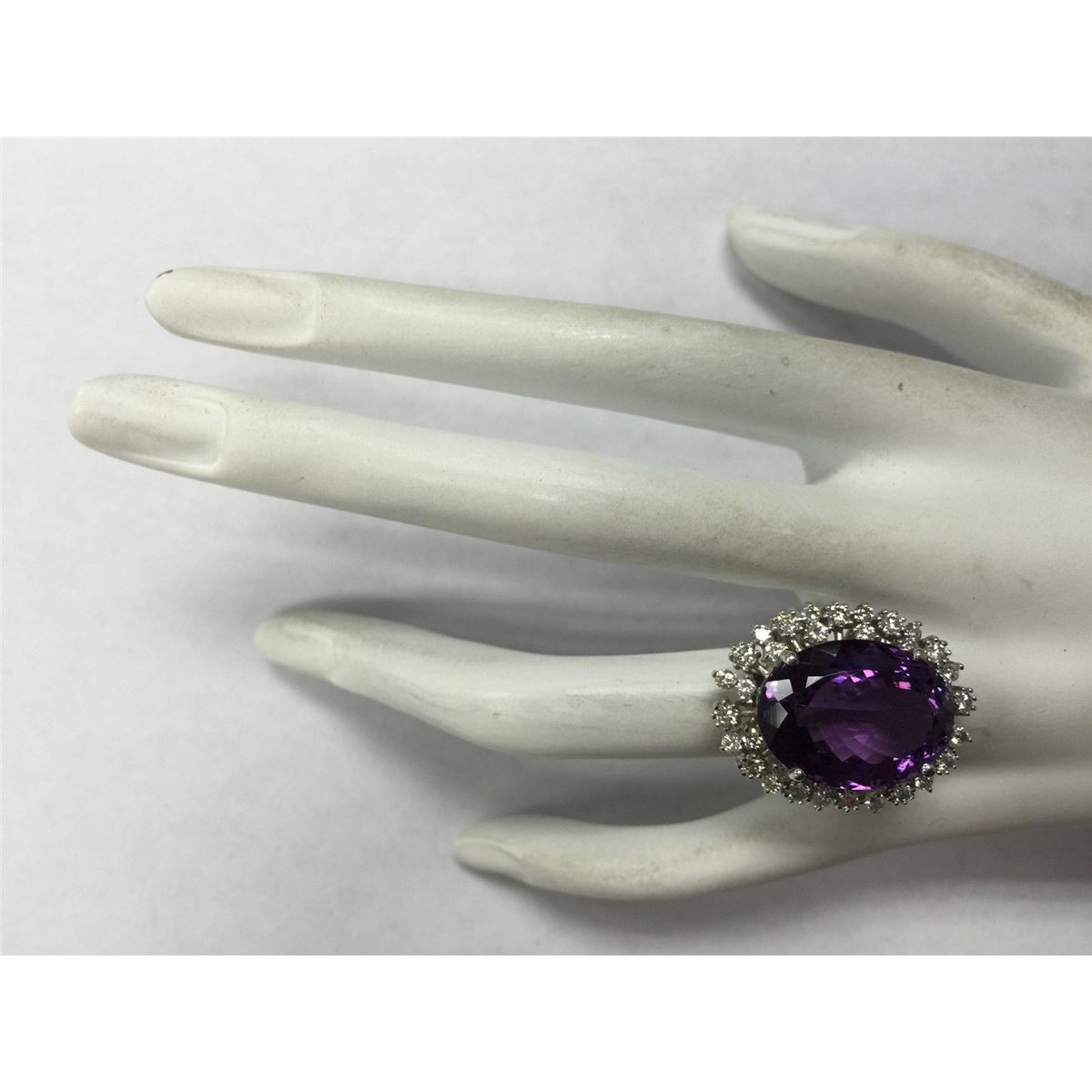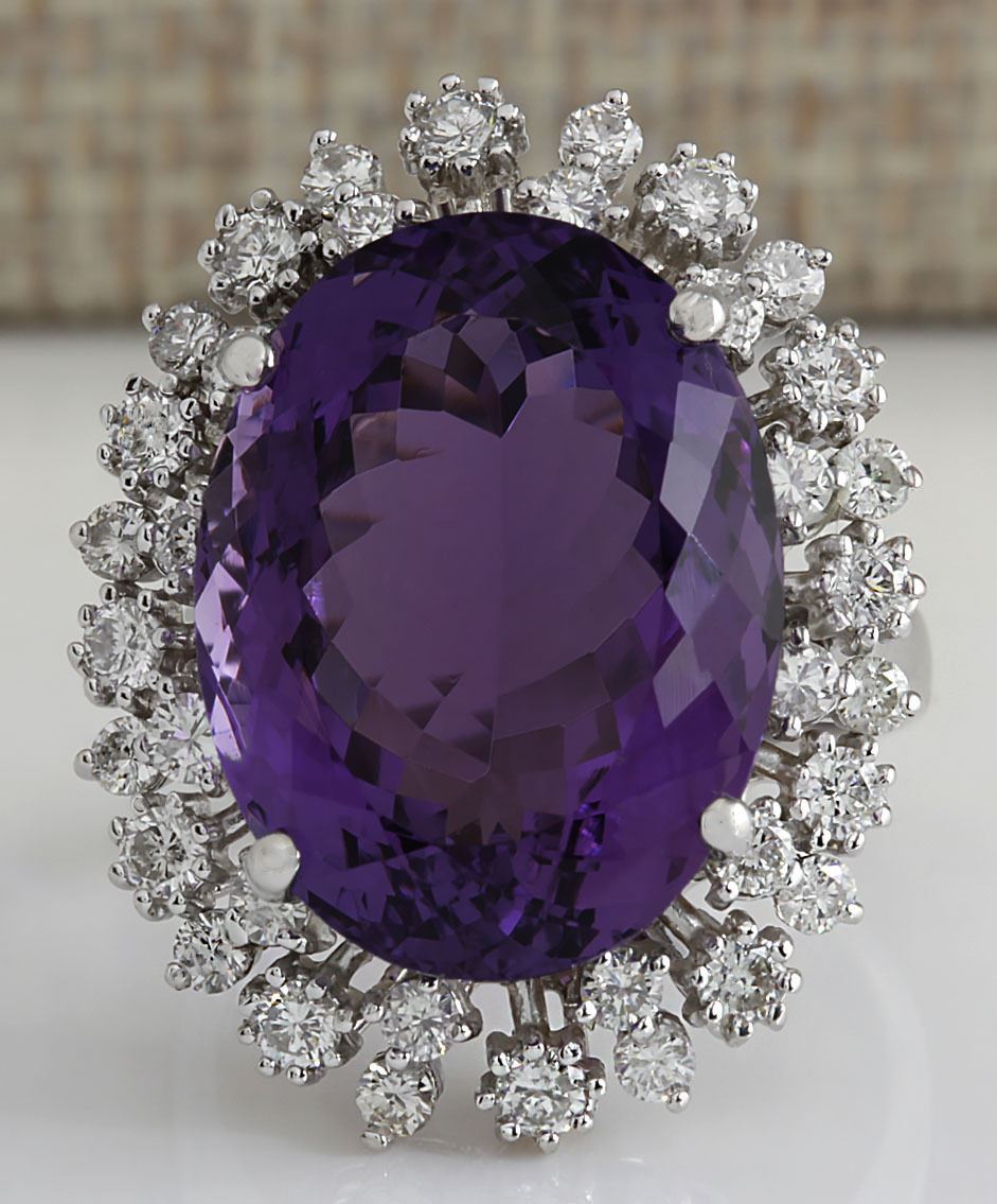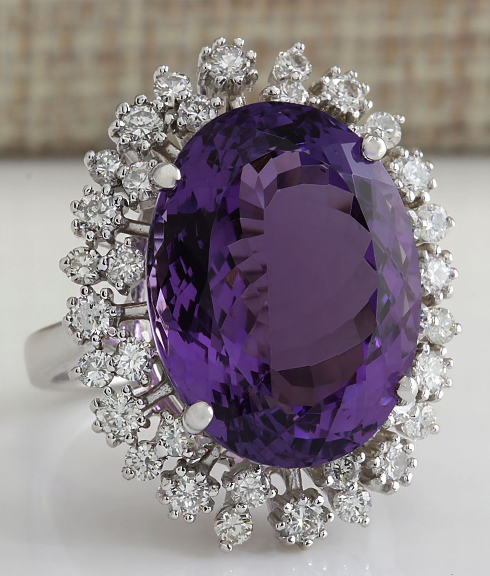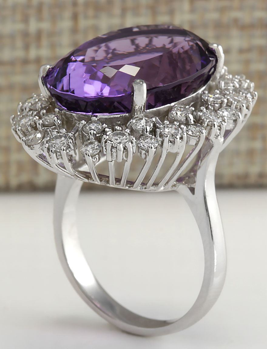 Stamped: 14K Ring Size: 6.5 Total Ring Weight: 7 Grams Diamond Weight: Total natural diamond weight is 1.25carat. SI1-SI2 clarity / G-H color Gemstone Weight: Total Natural Amethyst Weight is 14.58ctw (Measures: 18.52x14.08mm) Face Measures: 26.38x20.97mm Main stone color: Purple [SKU:703034]