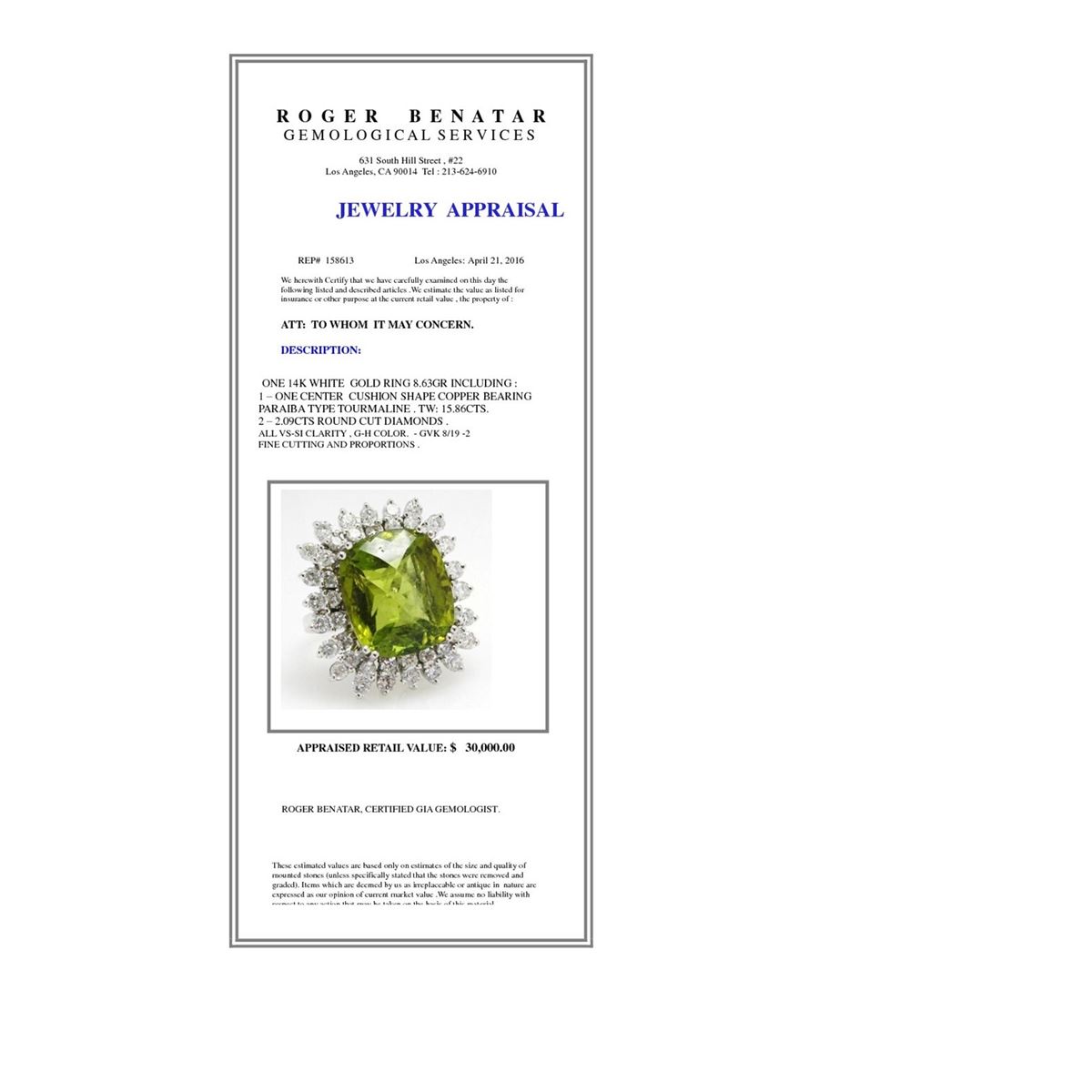 14K W/G RING NATURAL COPPER BEARRING Pariba TOURMALINE Ring :8.63GRAM /COPPER BEARRING Pariba TOURMALINE: 15.86CT/DIAMOND :2.09CT/#GVR1294