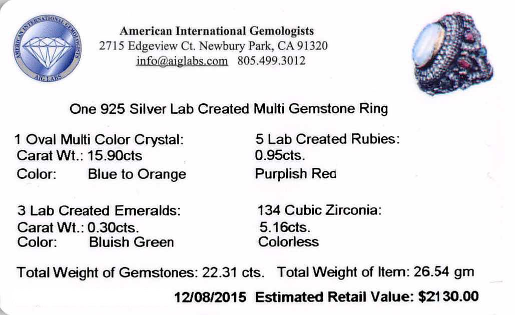 One 15.90ct Multicolor Crystal and Multi Gemstone Ring - 925 SILVER. The featured lab created multi color crystal is set within tiered lab created cubic zirconia bezels supported by tapering lab created ruby, lab created emerald and lab created cubic zirconia set shoulders, completed by a four millimeter wide band. Bright and anodized finish. Identified with markings of "925". Condition is new, good workmanship. Containing: One bezel set oval mixed cut laboratory created multi color crystal, measuring 17.00 x 12.00 x 6.40mm, approximate weight of 15.90ct., clarity is eye clean, cut is good. Two bezel set oval mixed cut laboratory created rubies, measuring 5.00 x 3.00 x 1.95mm, approximate total weight of 0.50ct., clarity is eye clean, type II, dark, very slightly brownish, slightly purplish red color, (GIA slpR 7/3), cut is good. Three bezel set round mixed cut laboratory created rubies, measuring 3.10 - 3.00 x 1.98 mm, approximate total weight of 0.45ct., clarity is eye clean, type II, dark, very slightly brownish, slightly purplish red color, (GIA slpR 7/3), cut is good. Three bezel set round mixed cut laboratory created emeralds, measuring 3.10 - 3.00 x 1.98 mm, approximate total weight of 0.30ct., clarity is eye clean, type III, dark, very slightly grayish, very slightly bluish green color, (GIA vslbG 7/3), cut is good. Six bezel set round brilliant cut laboratory created cubic zirconias, measuring 3.10 - 3.00 x 1.98 mm, approximate total weight of 1.32ct., clarity is eye clean, colorless, very slightly grayish, white color, (GIA W 0/3), cut is good. One hundred twenty-eight bead set round brilliant cut laboratory created cubic zirconias, measuring 1.70 - 1.50 x 1.04 mm, approximate total weight of 3.84ct., clarity is eye clean, colorless, very slightly grayish, white color, (GIA W 0/3), cut is good. Total Weight of Colored Stones 22.31ct. Total Weight of Ring 26.54gm. AIG Appraised at $2,130.00.