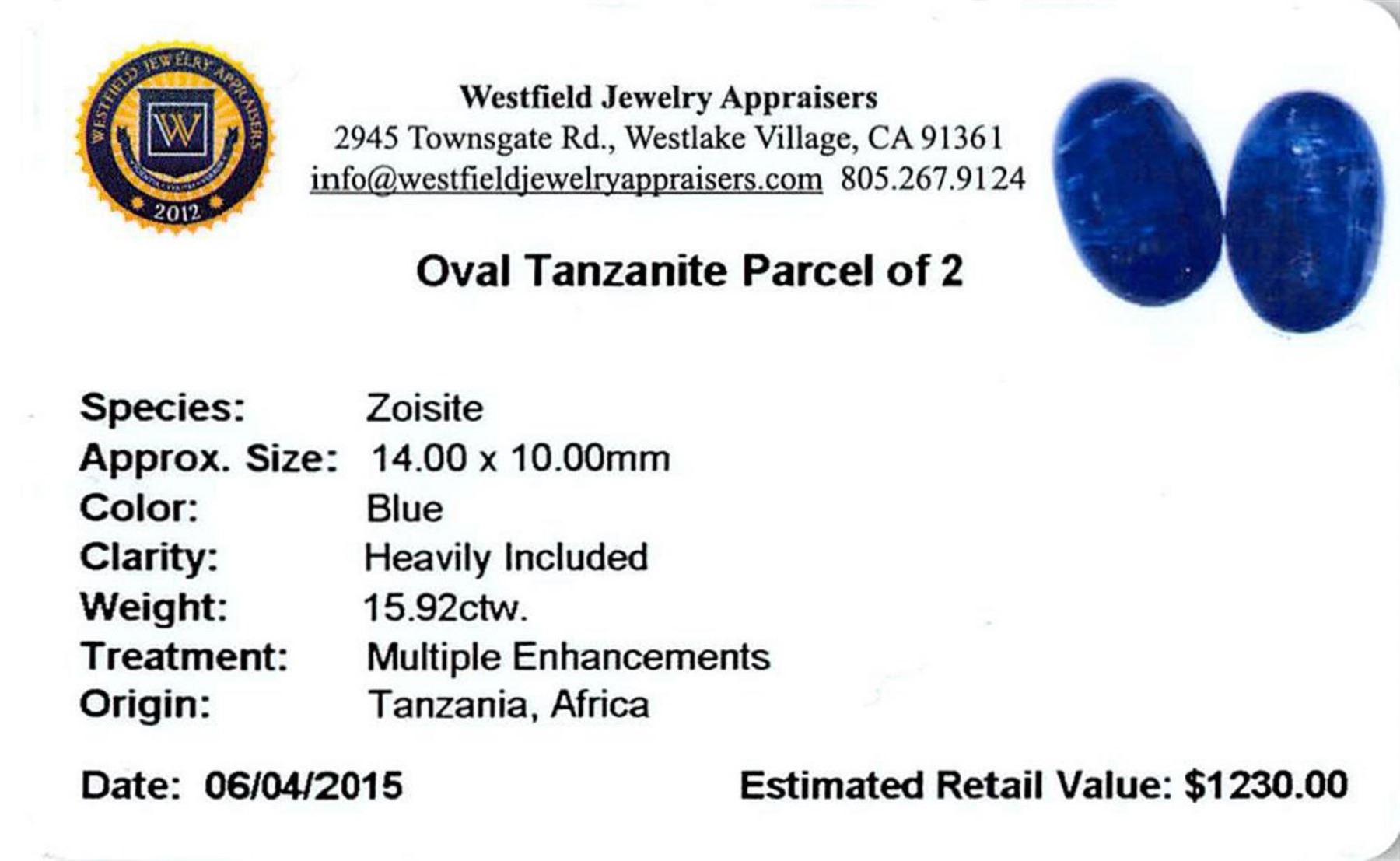 Two oval cabochon cut natural tanzanites, measuring 14.00 x 9.00 x 6.00mm, exact total weight 15.92ct., clarity is heavily included, type I, dark, moderately strong, blue color, (GIA B 7/4), cut is good. Measurements are an average for the pair. Transmitting light somewhat diffusely, transparent to translucent. Naturally occurring internal & external characteristics are present. Indications of heat treatment. Westfield Appraised.