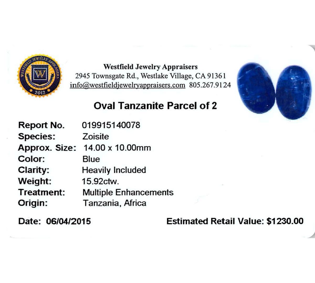 Two oval cabochon cut natural tanzanites, measuring 14.00 x 9.00 x 6.00mm, exact total weight 15.92ct., clarity is heavily included, type I, dark, moderately strong, blue color, (GIA B 7/4), cut is good. Measurements are an average for the pair. Transmitting light somewhat diffusely, transparent to translucent. Naturally occurring internal & external characteristics are present. Indications of heat treatment. Westfield Appraised at $1,530.00.