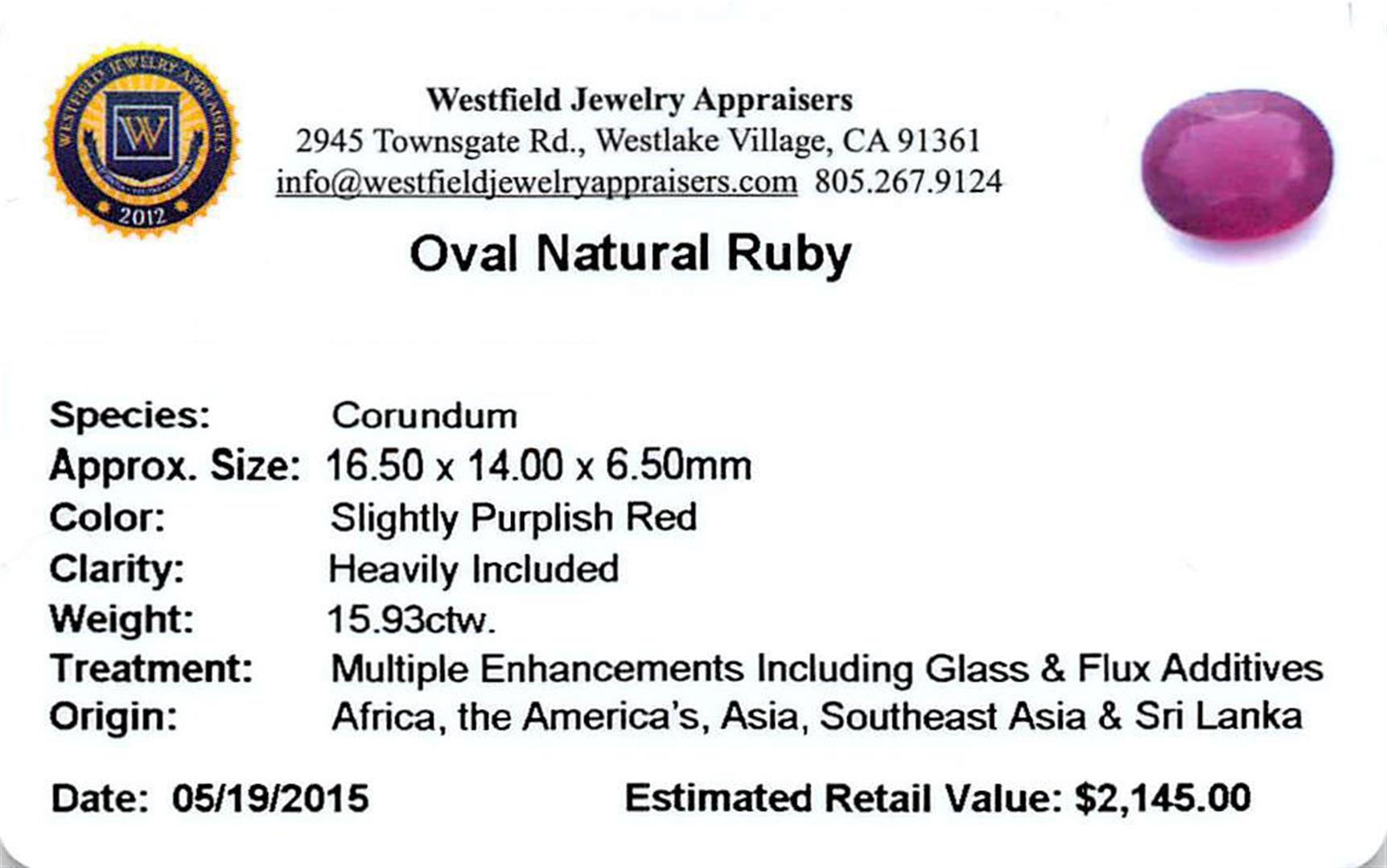 One oval mixed cut natural ruby, measuring 16.50 x 14.00 x 6.50mm, exact weight 15.93ct., clarity is heavily included, type II, medium dark, very slightly brownish, slightly purplish red color, (GIA slpR 6/3), cut is good. Transmitting light somewhat diffusely, transparent to translucent. Naturally occurring internal & external characteristics are present. Indications of laboratory high temperature heat treatment, with glass & flux additives. Ruby has a low tolerance to rhodium plating, repolishing the surface, & ultrasonic cleaning. Westfield Appraised at $2,145.00.