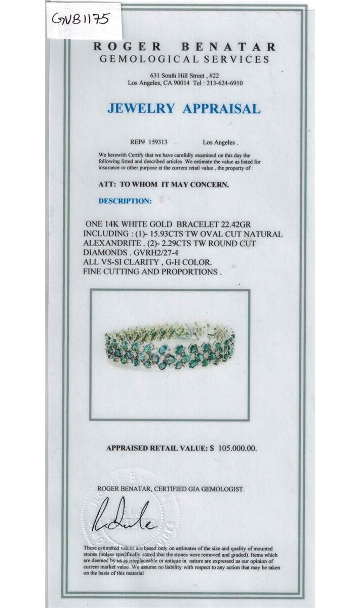 14K WHITE GOLD NATURAL ALEXANDRITE BRACELET:22.42GRAMS/DIAMOND:2.29CT/ALEXANDRITE:15.93CT/#GVB1175