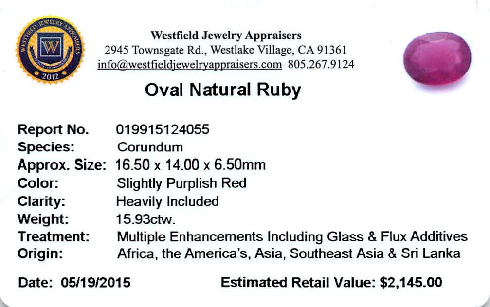 One oval mixed cut natural ruby, measuring 16.50 x 14.00 x 6.50mm, exact weight 15.93ct., clarity is heavily included, type II, medium dark, very slightly brownish, slightly purplish red color, (GIA slpR 6/3), cut is good. Transmitting light somewhat diffusely, transparent to translucent. Naturally occurring internal & external characteristics are present. Indications of laboratory high temperature heat treatment, with glass & flux additives. Ruby has a low tolerance to rhodium plating, repolishing the surface, & ultrasonic cleaning. Westfield Appraised at $2,145.00.
