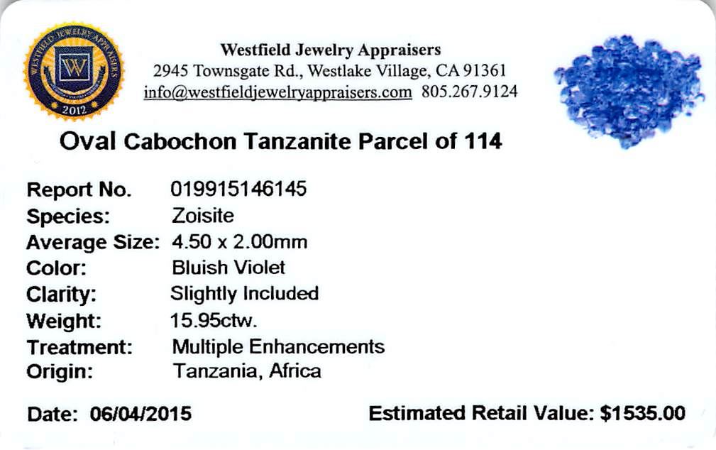 One hundred fourteen oval mixed cut natural tanzanites, measuring 4.00 x 2.50 x 1.63mm, exact total weight 15.95ct., clarity is slightly included, type I, medium, very slightly grayish, bluish violet color, (GIA bV 5/3), cut is good. Transmitting light with a minimum of distortion, transparent, Naturally occurring internal & external characteristics are present. Measurements & the color grade are an average for the group. Tanzanite is a very rare gemstone that is only found in the country of Tanzania. Originally discovered in 1967. Tiffany & Company, named the stone Tanzanite. It is found in the Usumburu Mountains that border the Umba Valley of northern Tanzania. Tanzanite occurs in gray, brown, violet, blue, reddish-purple, & green. The gem is interesting because of its exceptional pleochroism. Rotated in different directions a tanzanite will exhibit multiple changes of color. Tanzanite has a low tolerance to ultrasonic cleaning, and should not be cleaned using this method. Westfield Appraised at $1,535.00.