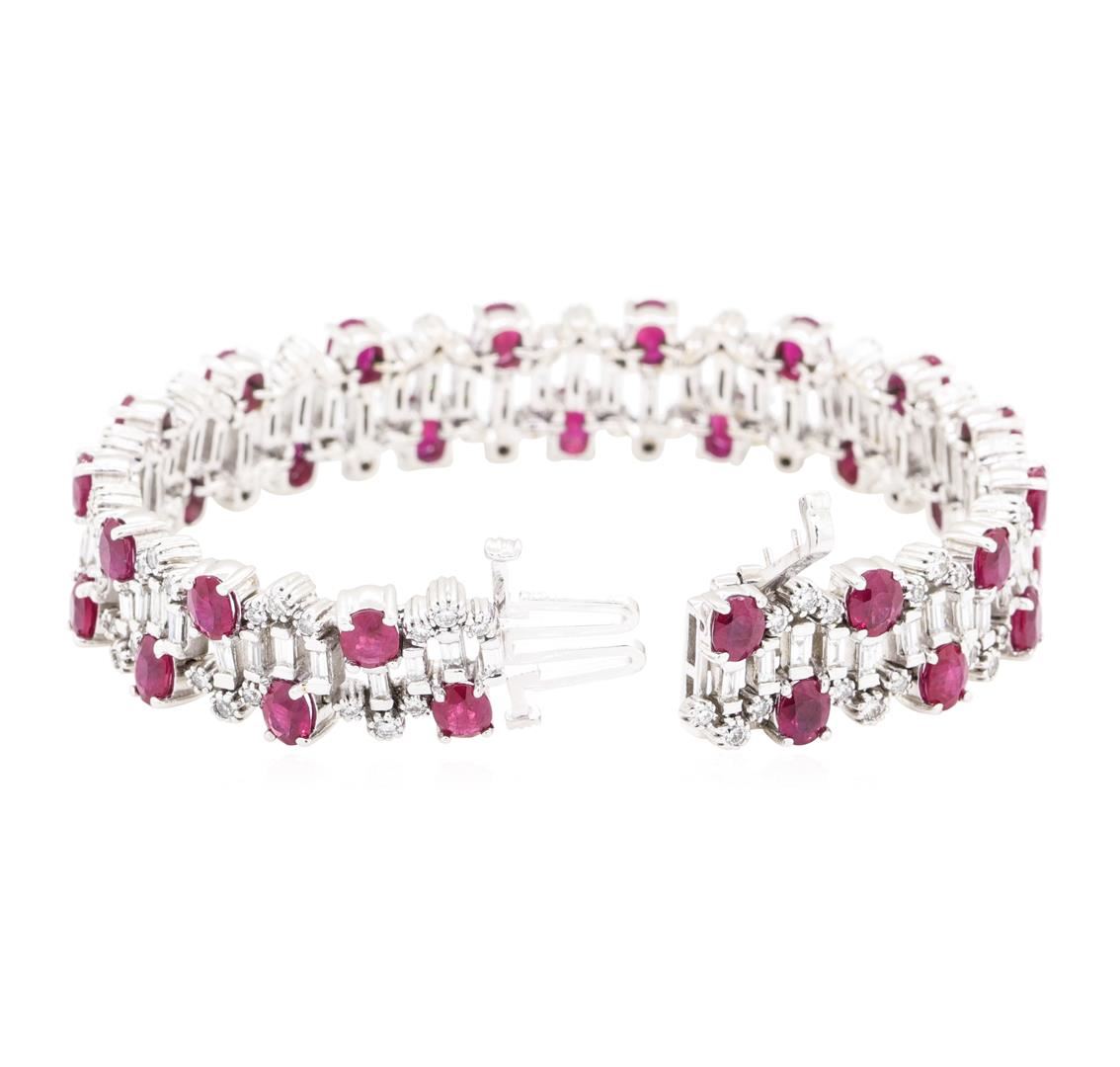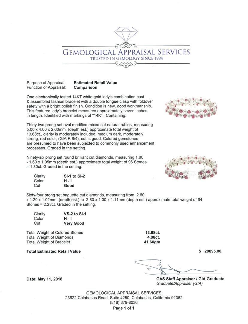 One electronically tested 14KT white gold lady's combination cast & assembled fashion bracelet with a double tongue clasp with foldover safety with a bright polish finish. This featured lady's bracelet measures approximately seven inches in length. Identified with markings of '14K'. Condition is new, good workmanship. Containing: Thirty-two prong set oval modified mixed cut natural rubies, measuring 5.00 x 4.00 x 2.60mm, (depth est.) approximate total weight of 13.68ct., clarity is moderately included, medium dark, moderately strong, red color, (GIA R 6/4), cut is good. Colored gemstones are presumed to have been subjected to commonly used enhancement processes. Graded in the setting. Ninety-Six prong set round brilliant cut diamonds, measuring 1.80 - 1.60 x 1.05mm (depth est.) approximate total weight of 96 Stones = 1.80ct. Graded in the setting. Color H - I Clarity SI-1 to SI-2 Cut Good Sixty-Four prong set baguette cut diamonds, measuring from 2.60 x 1.20 x 1.02mm (depth est.) to 2.80 x 1.30 x 1.11mm (depth est.) approximate total weight of 64 Stones = 2.28ct. Graded in the setting. Color H - I Clarity VS-2 to SI-1 Cut Very Good. Total Weight of Colored Stones 13.68ct.. Total Weight of Diamonds 4.08ct.. Total Weight of Bracelet 41.60gm GAS Appraised at  $20895.00. GAS Appraised at $20,895.00.