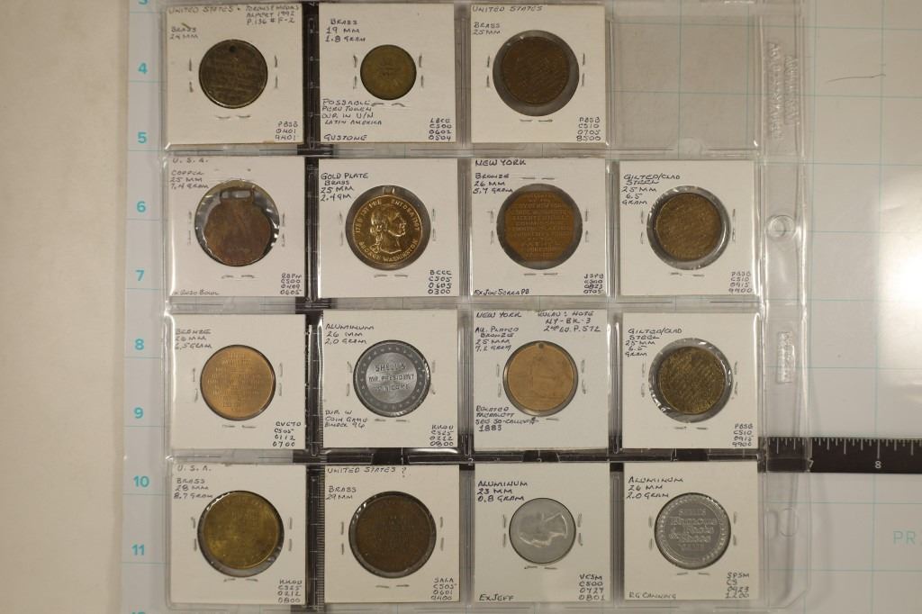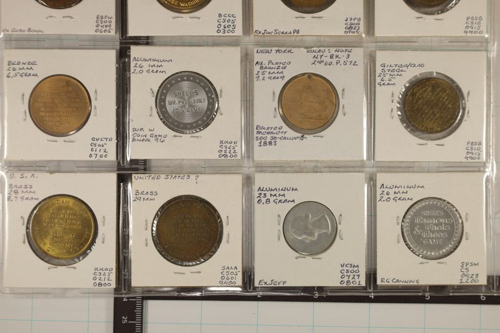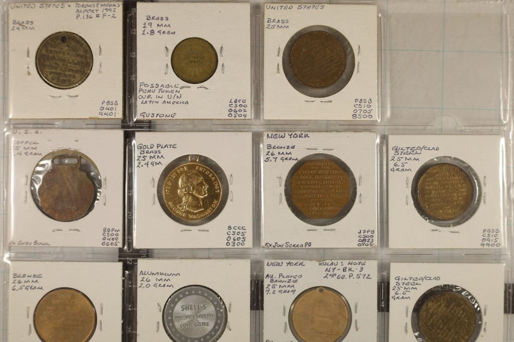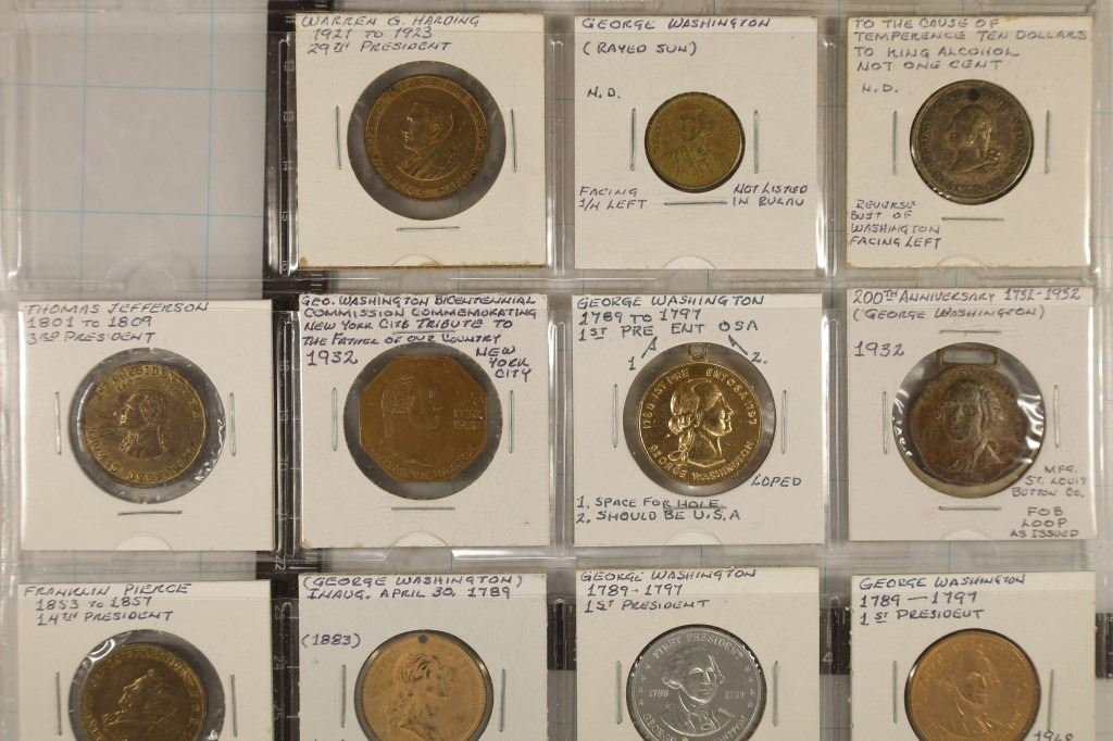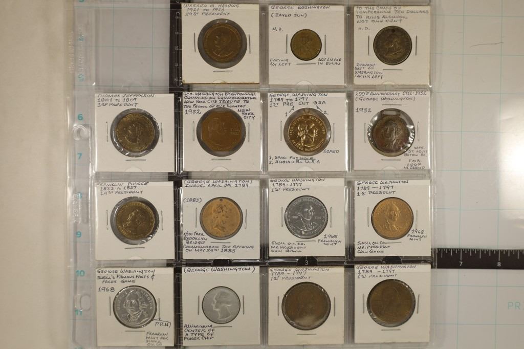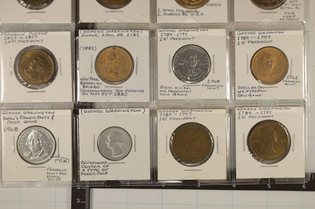 GEORGE WASHINGTON FOB, ALUMINUM CENTER OF A TYPE OF POKER CHIP, SHELL'S FAMOUS FACTS GAME CHIP, AND ALL OTHERS WITH PRESIDENTS