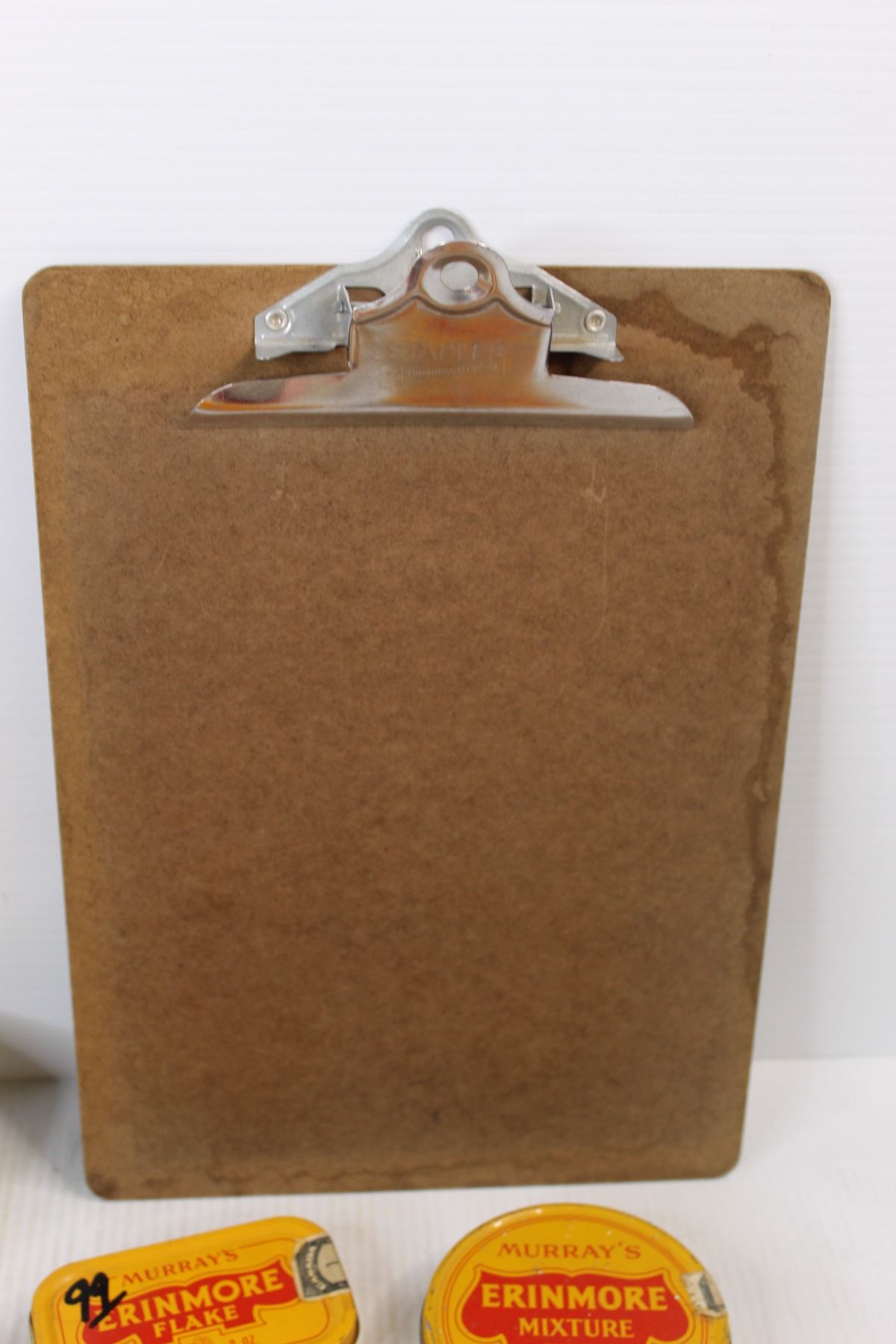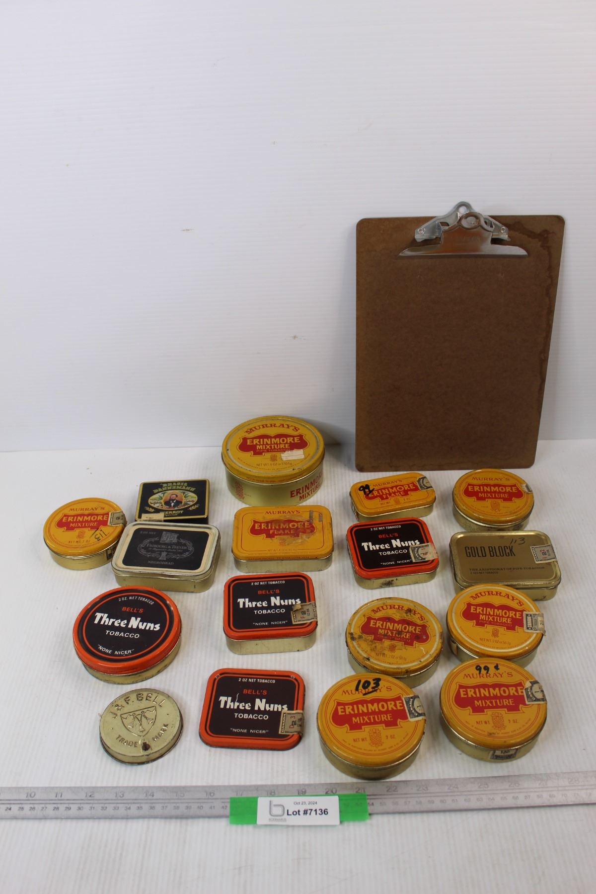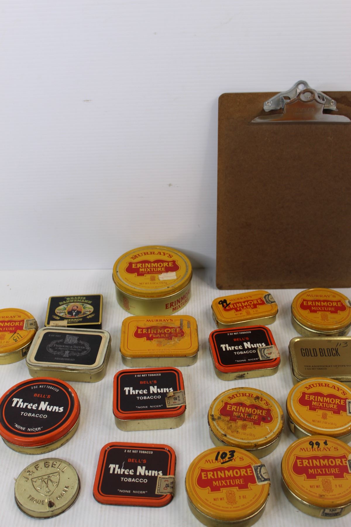 (15) Assorted Tabacco Tins, Three Nuns, Erin More, Misc., (2) Extra Lids, Clip Board