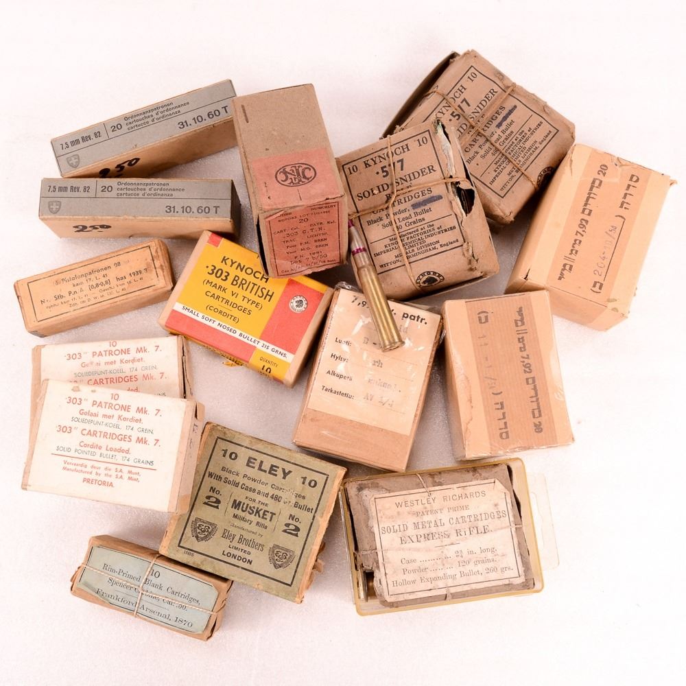 Includes Westley Richards Express Rifle, 7.92, 7.92 Israeli, 577 Solid Snider, South African 303 Mk7, 303 Bren Gun illuminating rounds, 303 Mk6, Eley No.2 Musket, 7.5mm, 50 cal Spencer Carbine, and WWII German 9mm.