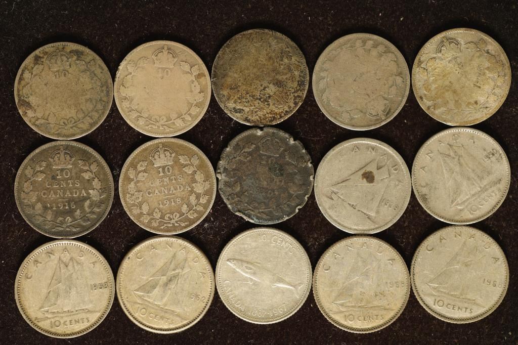 15 CANADA SILVER DIMES: 5 NO DATE, 1916, 1918,1920