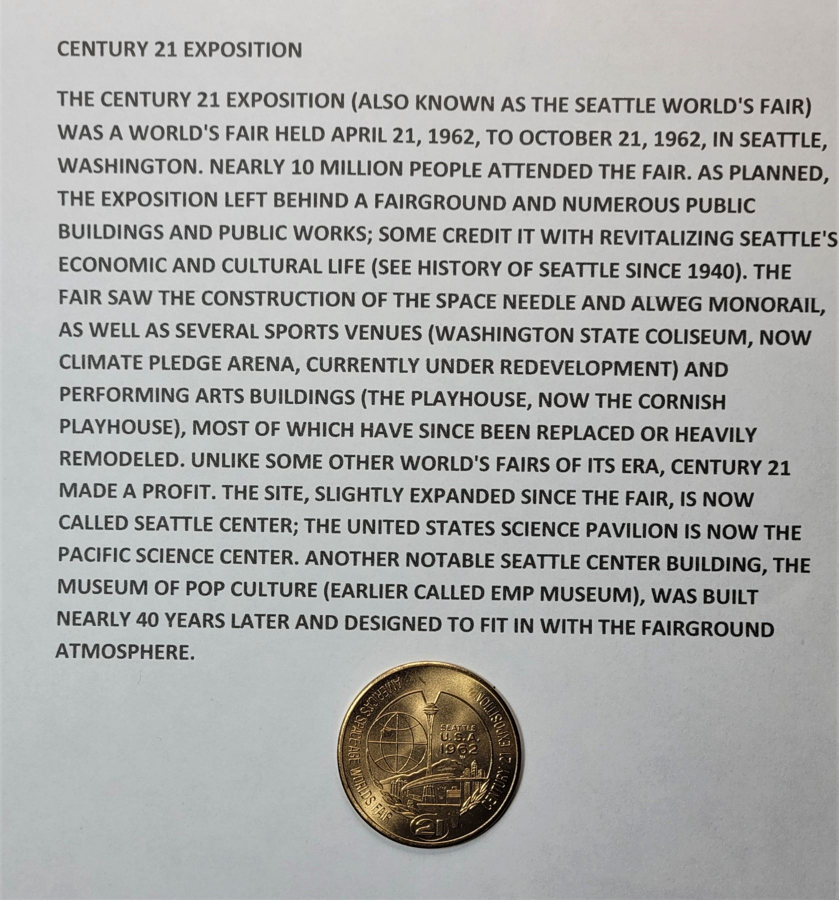CENTURY 21 EXPOSITION, ONE DOLLAR TOKEN.