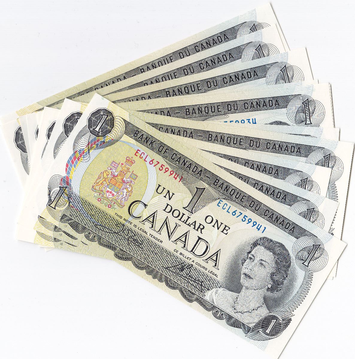 15 Consecutive 1973 Canadian $1 Bank Notes - All AU