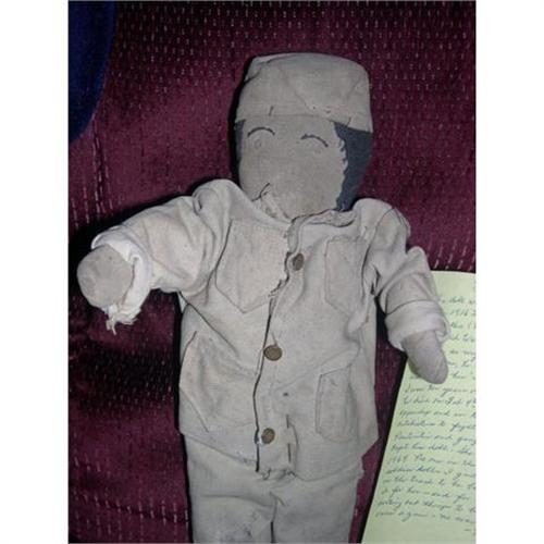 15" Cloth Boy Doll 1916 W/History Paper. The paper is from the person I purchased the doll from. The doll was her brother's. The doll was made in 1916 and the brother died in 1927 from a raptured appendix.I'm so glad I had the lady write down the history of this doll. The doll is cotton stuffed with black stocking material for hair. He has embroidered features. He has a rust spot on the front of one leg and has overall soil. Doll comes from a smoke free environment. Buyer to pay 10.00 shipping, handling, and insurance. Thanks for viewing.