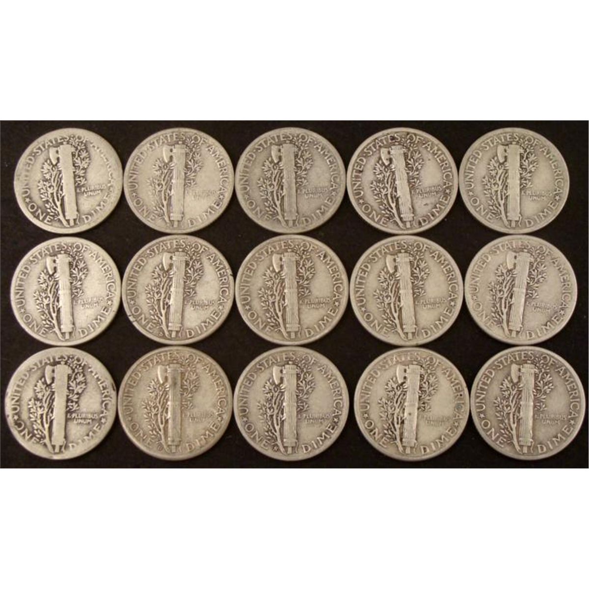 15 Different Date Mercury Silver Dimes * Dates: 1917, 1920, 1924, 1936, 1937, 1939, 1940, 1941, 1942, 1943, 1944-P, D, S, 1945-P, S