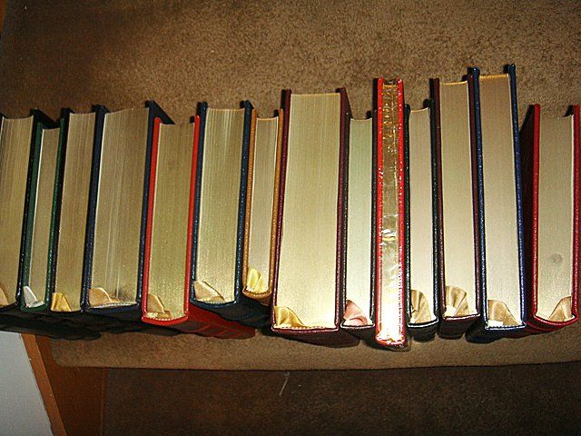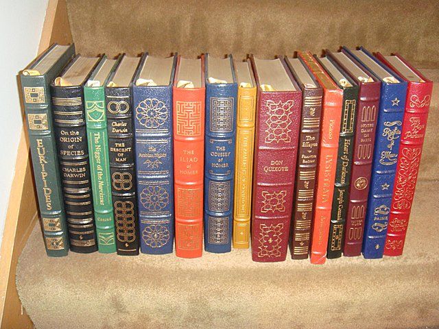 15 Estate Books. Beautifully bound with gold lettering on spines. This set of classic literature includes: The Descent of Man and On the Origin of Species, Charles Darwin. Two plays for Puritans, George Bernard Shaw. Rights of Man, Paine. Notre Dame De Paris, Victor Hugo. The Nigger of the Narcissus, Conrad. The Analects of Confucius, Lionel Giles. Medea Hippolytus/The Bacchae, Euripides. Heart of Darkness, Joseph Conrad. The Effayes, Francis Bacon. Lysistrata, Picasso, Don Quixote, Miquel de Cervantes. The Odyssey of Homer and The Iliad, English Translation by Alexander Pope, The Arabian Nights, Translated by Sir Richard Burton.