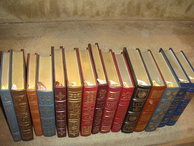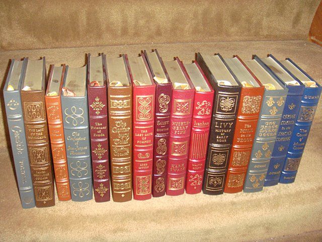 15 Estate Books. Beautifully bound with gold lettering on spines. This set of classic literature includes: The Confessions of Jean-Jcques, Rousseau. Ivanhoe, Walter Scott. The Prince, Niccolo Machiavelli. Huckleberry Finn, Mark Twain. The Count of Monte Cristo Dumas / Vol. 1. The Man in the Iron Mask and The Three Musketeers, Dumas. The Mill on the Floss, George Eliot. Livy (History of Early Rome), Titus Livius. The Last of the Mohican's, James Fenimore Cooper. Candide or Optimism, Voltaire. Faust, Johann Wolfgang Von Goethe. The Last Days of Pompeii, Lord Lytton. The Canterbury Tales, Geoffrey Chaucer. The Prinsoner of Zenda, Anthony Hope.