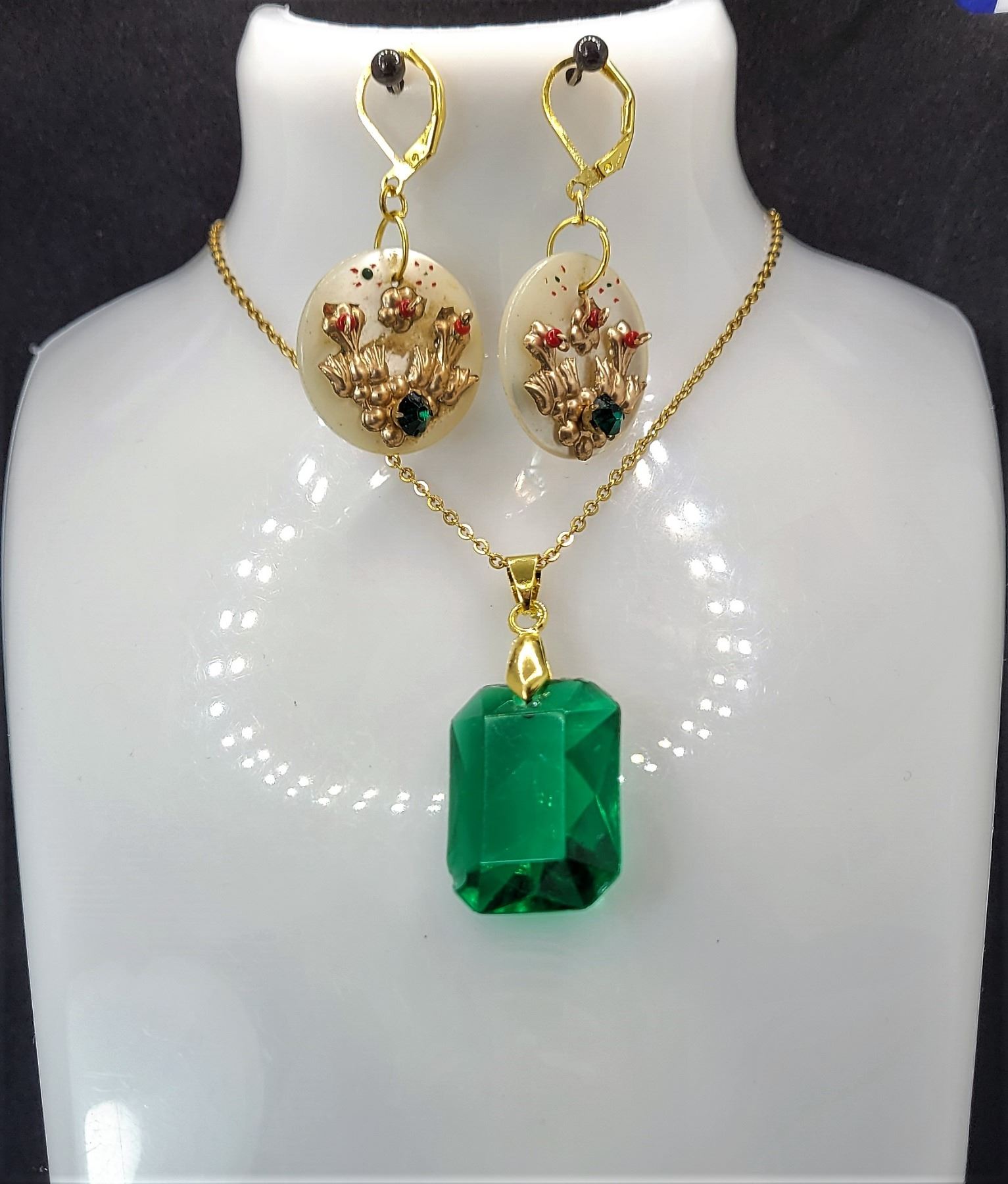 PENDANT ON 17" CHAIN AND COORDINATED ROUND MOTHER OF PEARL EARRINGS WITH RED AND GREEN CRYSTALS AND GOLD TONE FLOWERS AND LEAVES.