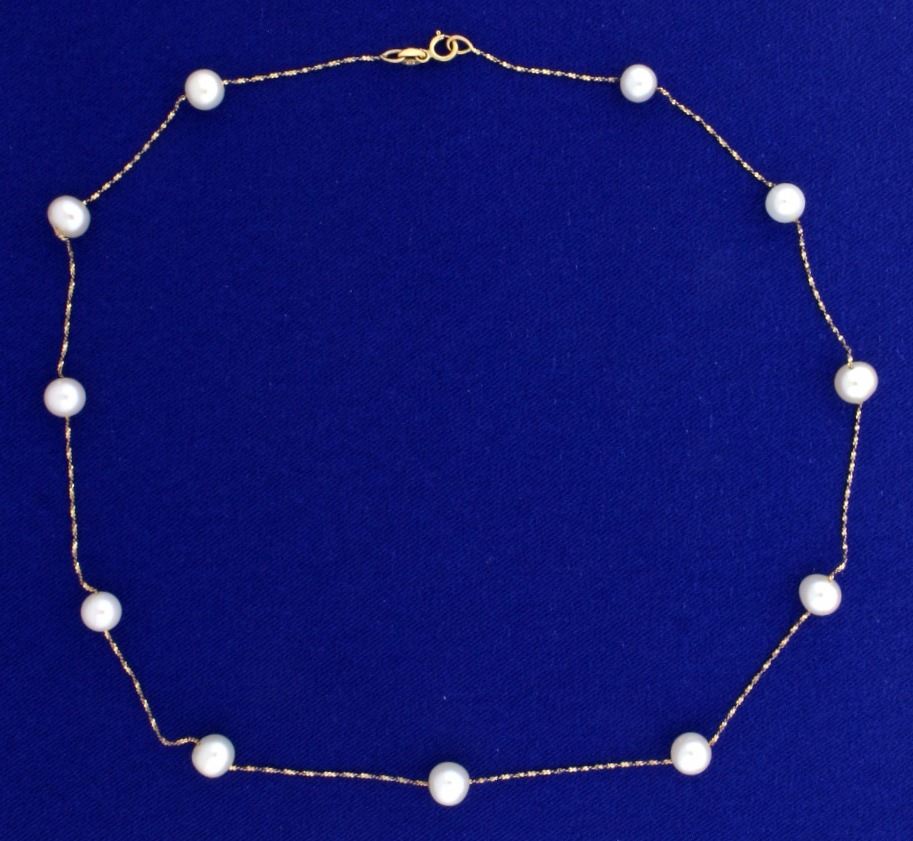 In 14k yellow gold. Contains eleven 6mm Akoya pearls with beautiful white color and luster. Chain is .7mm thick twist style that is diamond cut for a bright sparkle finish. 4.0g.
