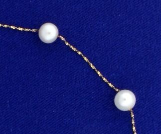 In 14k yellow gold. Contains eleven 6mm Akoya pearls with beautiful white color and luster. Chain is .7mm thick twist style that is diamond cut for a bright sparkle finish. 4.0g.
