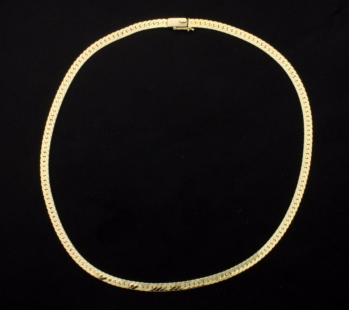 This 14K yellow gold necklace is 3.6mm wide and has a safety clasp. 13.0g