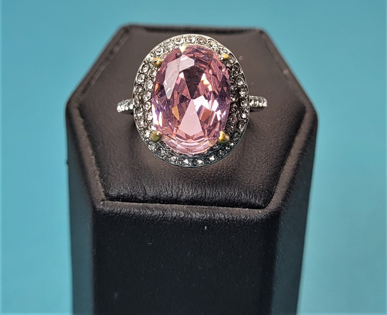 RING WITH CLEAR DOUBLE HALO CZ & ON THE SHOULDERS, SIZE 7. JEWELLERY