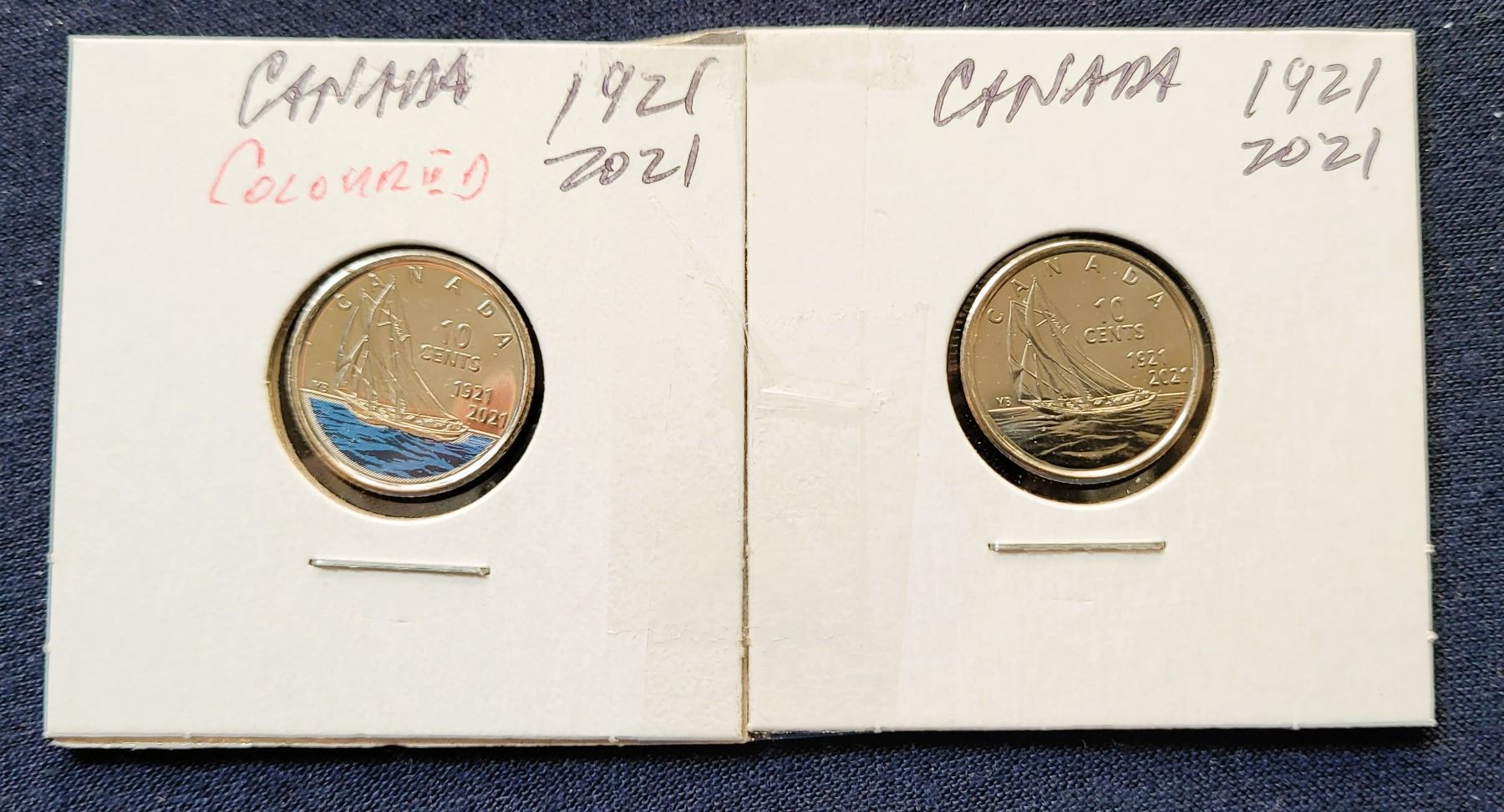 100TH ANNIVERSARY OF THE LAUNCH OF THE BLUENOSE, OUT OF LUNENBURG, NS, 1921-2021, ONE IS COLORIZED. CURRENCY