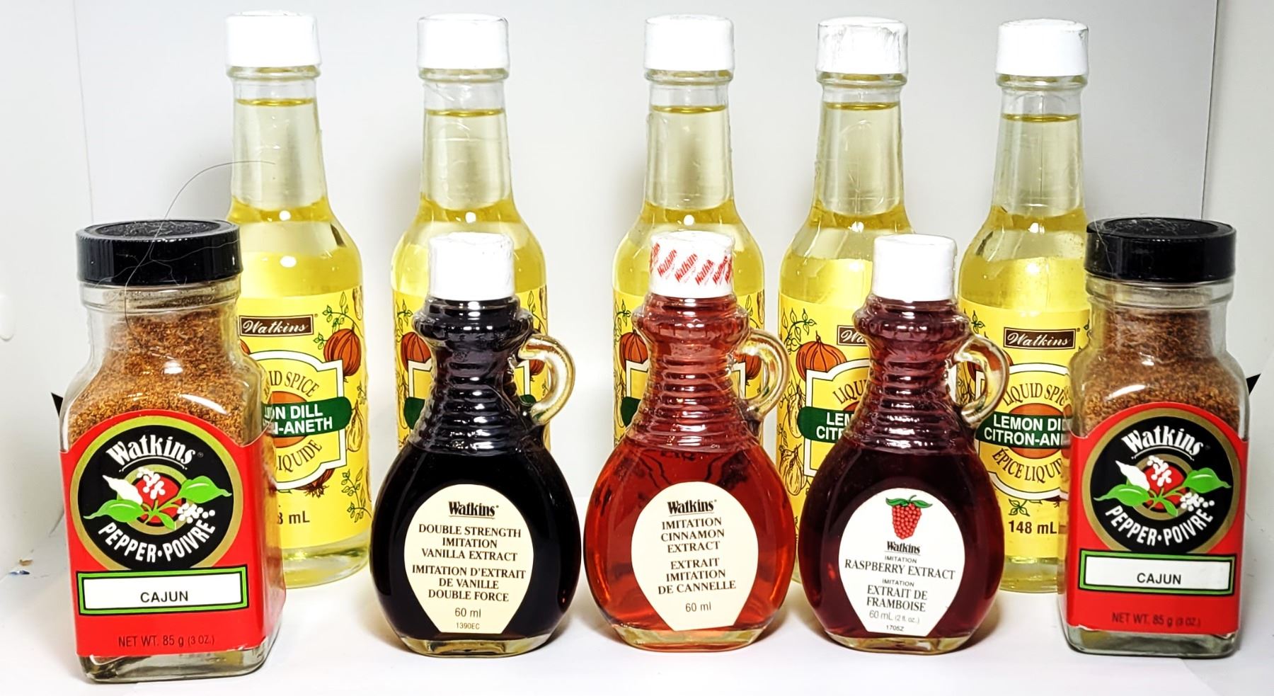 INCLUDING 5 BOTTLES OF DILL/LEMON LIIQUID SPICE, 2 JARS OF CAJUN SPICE AND 1 OF EACH, VANILLA, CINNAMON & RASPBERRY EXTRACTS. FOOD